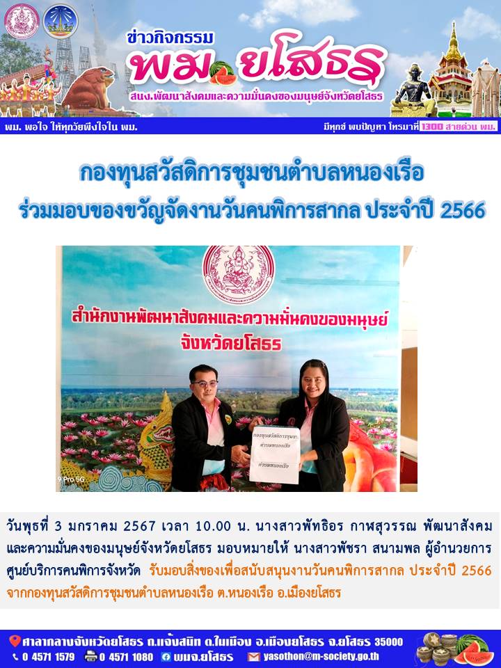 วันที่ 21 ก.พ. 2567 (11:42 น.)วันพุธที่ 3 มกราคม 2567 เวลา 10.00 น. นางสาวพัทธิอร กาฬสุวรรณ พัฒนาสังคมและความมั่นคงของมนุษย์จังหวัดยโสธร มอบหมายให้ นางสาวพัชรา สนามพล ผู้อำนวยการศูนย์บริการคนพิการจังหวัด รับมอบสิ่งของเพื่อสนับสนุนงานวันคนพิการสากล ประจำปี 2566 จากกองทุนสวัสดิการชุมชนตำบลหนองเรือ ต.หนองเรือ อ.เมืองยโสธร