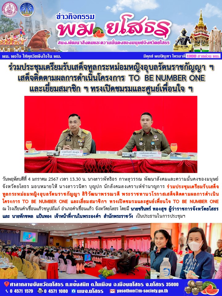 วันที่ 21 ก.พ. 2567 (11:51 น.)วันพฤหัสบดีที่ 4 มกราคม 2567 เวลา 13.30 น. นางสาวพัทธิอร กาฬสุวรรณ พัฒนาสังคมและความมั่นคงของมนุษย์จังหวัดยโสธร มอบหมายให้ นางสาววนิดา บุญปก นักสังคมสงเคราะห์ชำนาญการ ร่วมประชุมเตรียมรับเสด็จ ทูลกระหม่อมหญิงอุบลรัตนราชกัญญา สิริวัฒนาพรรณวดี พระราชทานวโรกาสเสด็จติดตามผลการดำเนินโครงการ TO BE NUMBER ONE และเยี่ยมสมาชิกฯnทรงเปิดชมรมและศูนย์เพื่อนใจ TO BE NUMBER ONE ณ โรงเรียนคำเขื่อนแก้วชนูปถัมภ์ อำเภอคำเขื่อนแก้ว จังหวัดยโสธร โดยมี นายชรินทร์ ทองสุข ผู้ว่าราชการจังหวัดยโสธร และ นายทักขพล แป้นทอง เจ้าหน้าที่งานในพระองค์ฯ สำนักพระราชวัง เป็นประธานในการประชุมฯ