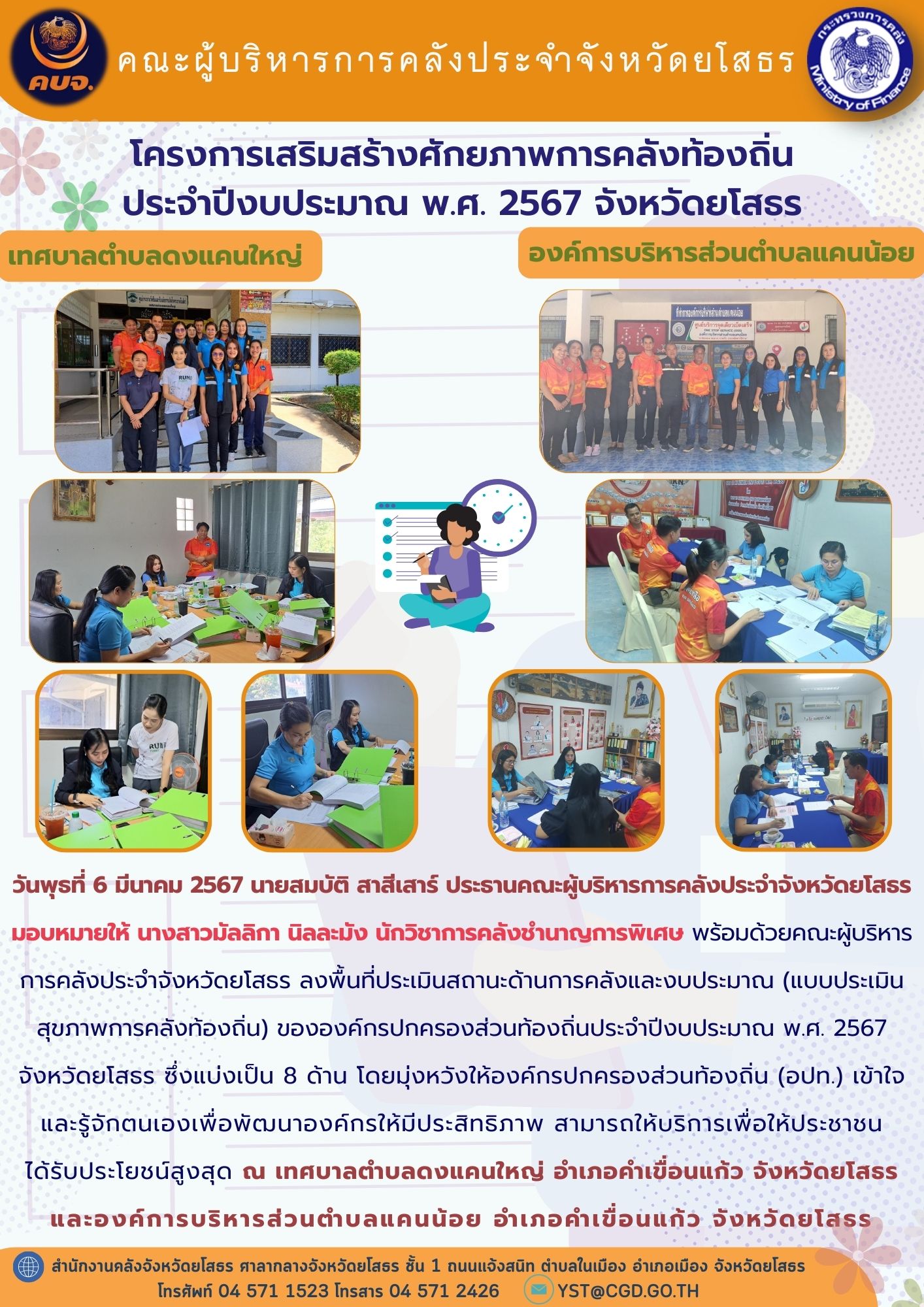 วันพุธที่ 6 มีนาคม 2567 นายสมบัติ สาสีเสาร์ ประธานคณะผู้บริหารการคลังประจำจังหวัดยโสธร มอบหมายให้นางสาวมัลลิกา นิลละมัง นักวิชาการคลังชำนาญการพิเศษ พร้อมด้วยคณะผู้บริหารการคลังประจำจังหวัดยโสธร ลงพื้นที่ประเมินสถานะด้านการคลังและงบประมาณ (แบบประเมิ