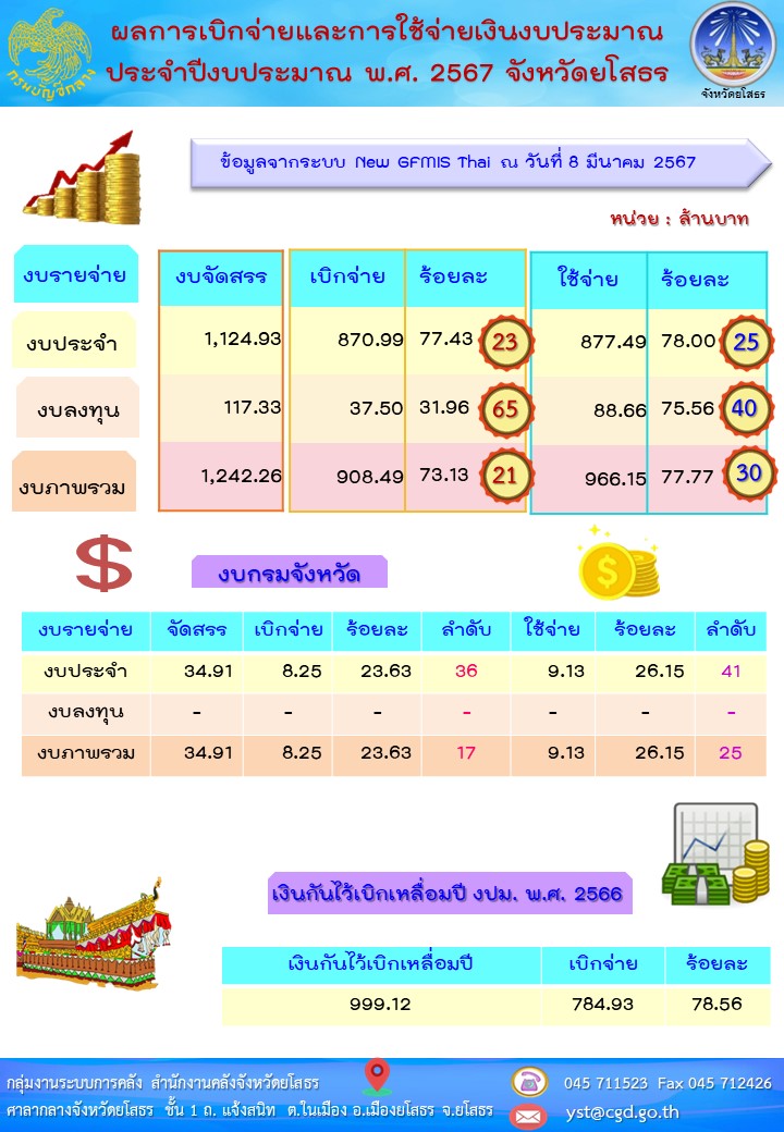 รายงานผลการเบิกจ่ายและใช้จ่ายเงินงบประมาณของจังหวัดยโสธร ข้อมูล ณ วันที่ 8 มีนาคม 2567