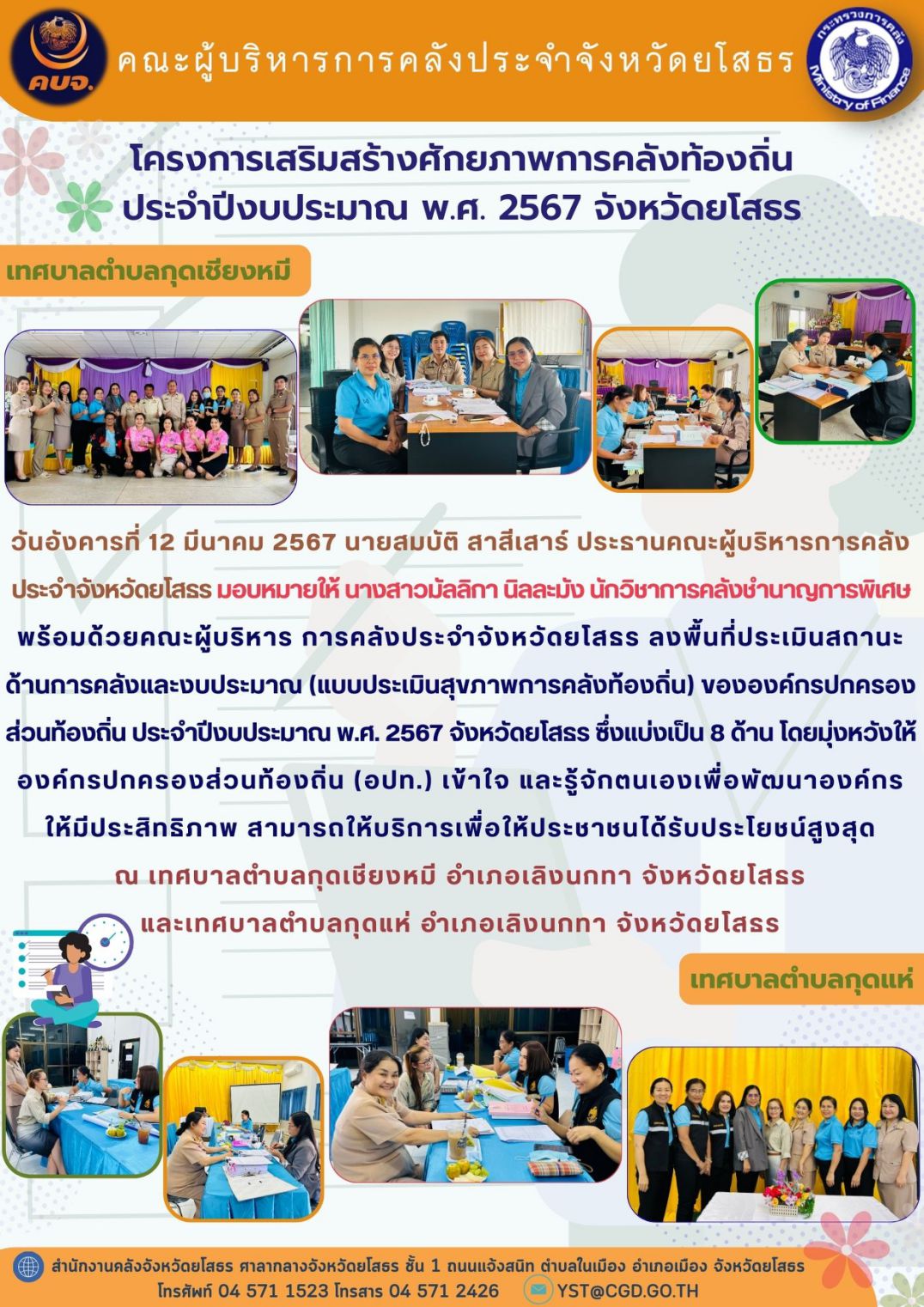 วันอังคารที่ 12 มีนาคม 2567 นายสมบัติ สาสีเสาร์ ประธานคณะผู้บริหารการคลังประจำจังหวัดยโสธร มอบหมายให้ นางสาวมัลลิกา นิลละมัง นักวิชาการคลังชำนาญการพิเศษ พร้อมด้วยคณะผู้บริหาร การคลังประจำจังหวัดยโสธร ลงพื้นที่ประเมินสถานะด้านการคลังและงบประมาณ (แบบปร