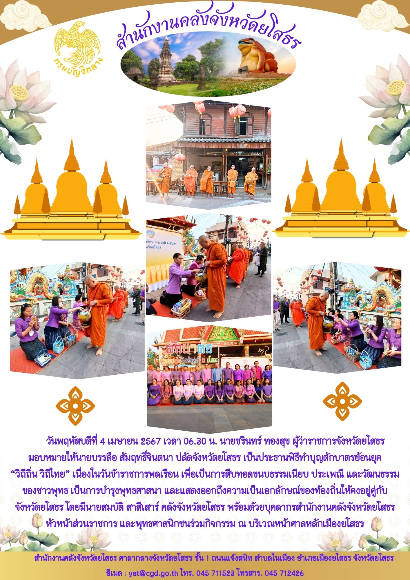 วันพฤหัสบดีที่ 4 เมษายน 2567 เวลา 06.30 น. นายชรินทร์ ทองสุข ผู้ว่าราชการจังหวัดยโสธร มอบหมายให้นายบรรลือ สัมฤทธิ์จินตนา ปลัดจังหวัดยโสธร เป็นประธานพิธีทำบุญตักบาตรย้อนยุค “วิถีถิ่น วิถีไทย” เนื่องในวันข้าราชการพลเรือน เพื่อเป็นการสืบทอดขนบธรรมเนียบ