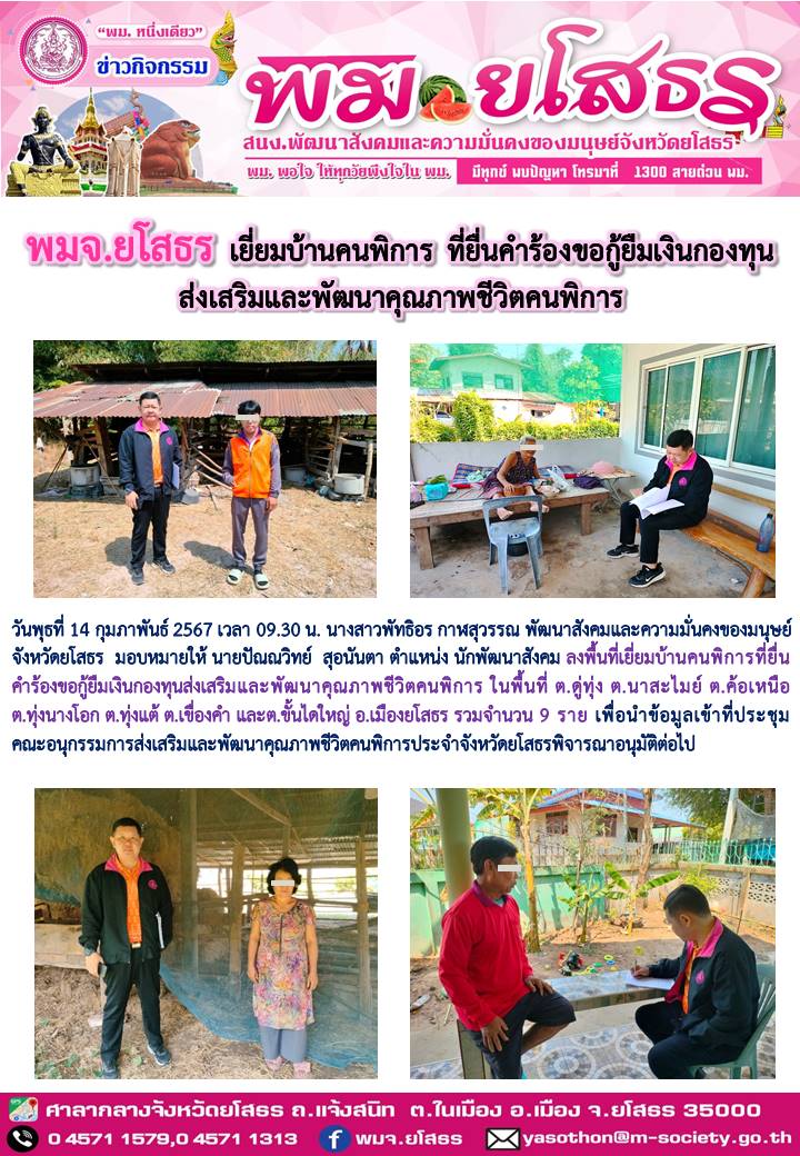 พมจ.ยโสธร เยี่ยมบ้านคนพิการที่ยื่นคำร้องขอกู้ยืมเงินกองทุนส่งเสริมและพัฒนาคุณภาพชีวิตคนพิการ (14 กุมภาพันธ์ 2567)