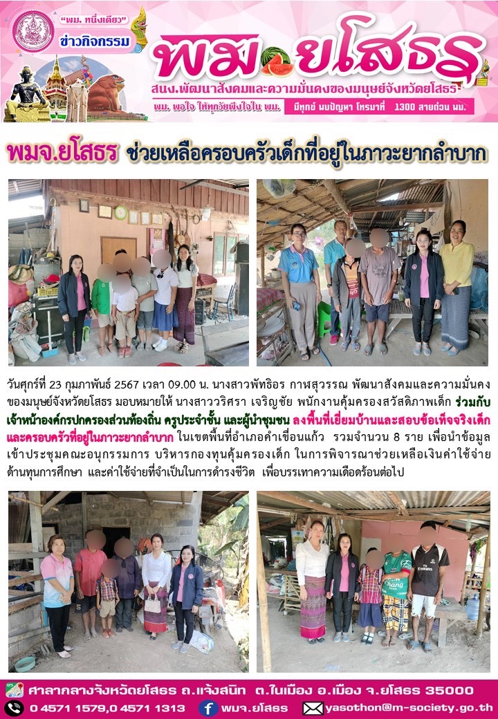 พมจ.ยโสธร ลงพื้นที่เยี่ยมบ้านและสอบข้อเท็จจริงเด็กและครอบครัวที่อยู่ในภาวะยากลำบาก (23 กุมภาพันธ์ 2567)