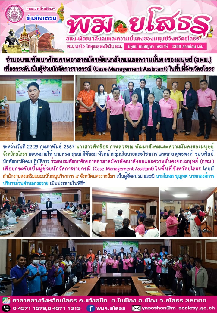 พม.ยโสธร ร่วมอบรมพัฒนาศักยภาพอาสาสมัครพัฒนาสังคมและความมั่นคงของมนุษย์ (อพม.) เพื่อยกระดับเป็นผู้ช่วยนักจัดการรายกรณี (Case Management Assistant ในพื้นที่ จังหวัดยโสธร