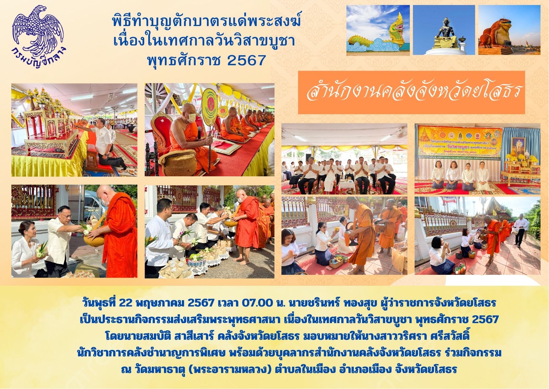 วันพุธที่ 22 พฤษภาคม 2567 เวลา 07.00 น. นายชรินทร์ ทองสุข ผู้ว่าราชการจังหวัดยโสธร เป็นประธานกิจกรรมส่งเสริมพระพุทธศาสนา เนื่องในเทศกาลวันวิสาขบูชา พุทธศักราช 2567 โดยนายสมบัติ สาสีเสาร์ คลังจังหวัดยโสธร มอบหมายให้นางสาววริศรา ศรีสวัสดิ์ นักวิชาการคล
