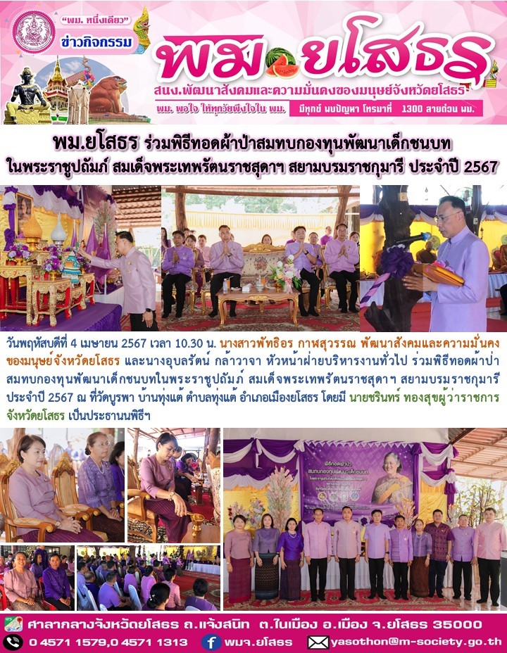 พมจ.ยโสธร ร่วมพิธีทอดผ้าป่าสมทบกองทุ นพัฒนาเด็กชนบทในพระราชูปถัมภ์ สมเด็จพระเทพรัตนราชสุดา ฯ สยามบรมราชกุมารี ประจำปี 2567 (4 เมษายน 2567)