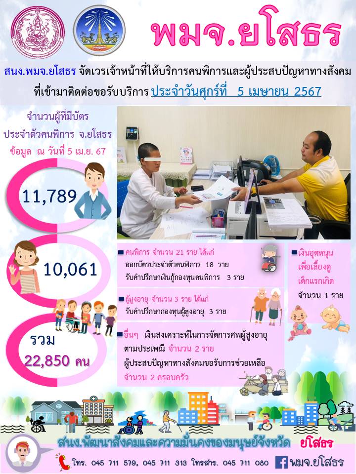 สนง.พมจ.ยโสธร จัดเวรเจ้าหน้าที่ให้บริการคนพิการและผู้ประสบปัญหาทางสังคม ที่เข้ามาติดต่อขอรับบริการ (5 เมษายน 2567)