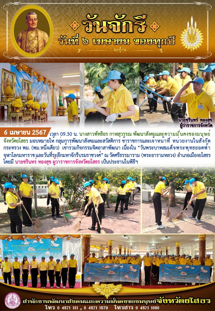 วันที่ 4 มิ.ย. 2567 (16:16 น.)วันเสาร์ที่ 6 เมษายน 2567 เวลา 09.30 น. นางสาวพัทธิอร กาฬสุวรรณ พัฒนาสังคมและความมั่นคงของมนุษย์จังหวัดยโสธร มอบหมายให้ กลุ่มการพัฒนาสังคมและสวัสดิการ ข้าราชการและเจ้าหน้าที่ หน่วยงานในสังกัดกระทรวง พม. (พม.หนึ่งเดียว) เข้าร่วมกิจกรรมจิตอาสาพัฒนา เนื่องใน “วันพระบาทสมเด็จพระพุทธยอดฟ้าจุฬาโลกมหาราช และวันที่ระลึกมหาจักรีบรมราชวงศ์” ณ วัดศรีธรรมาราม (พระอารามหลวง) อำเภอเมืองยโสธรโดยมี นายชรินทร์ ทองสุข ผู้ว่าราชการจังหวัดยโสธร เป็นประธานในพิธีฯ
