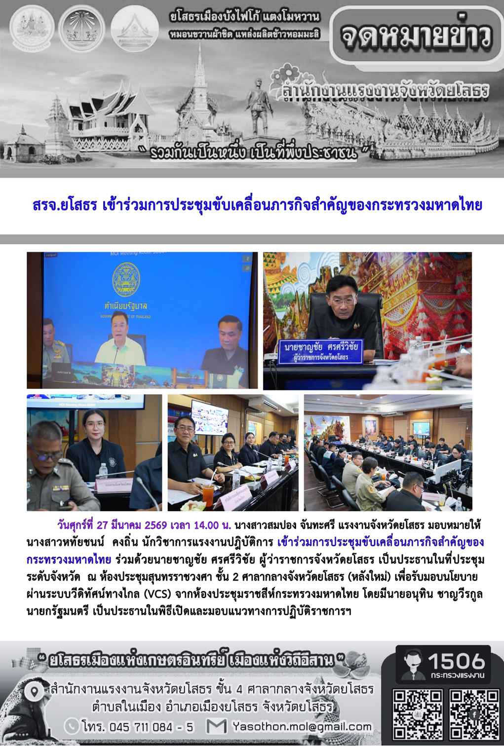 - [16:06] ทั่วไป สรจ.ยโสธร เข้าร่วมการประชุมขับเคลื่อนภารกิจสำคัญของกระทรวงมหาดไทย