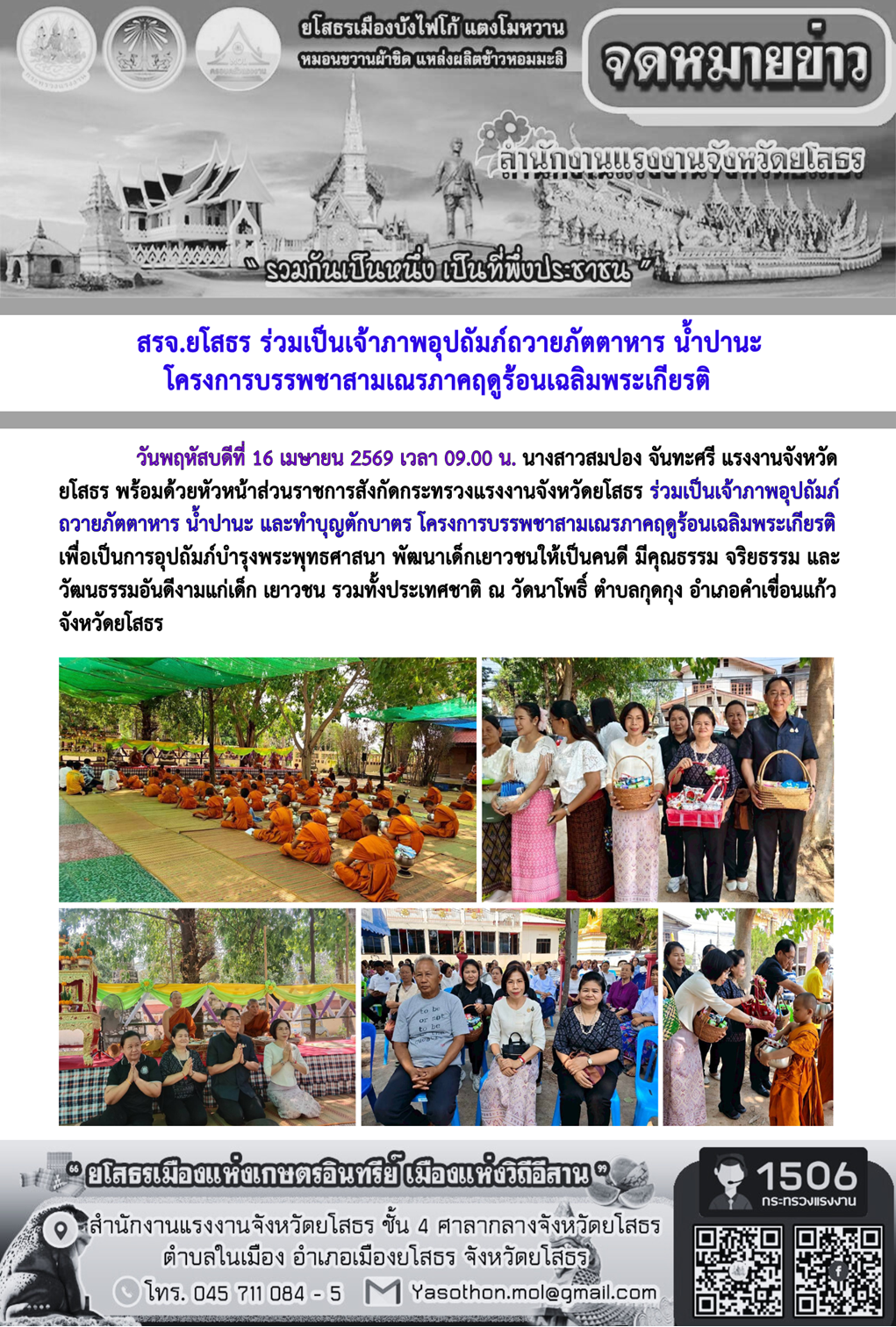 - [09:26] ทั่วไป สรจ.ยโสธร ร่วมเป็นเจ้าภาพอุปถัมภ์ถวายภัตตาหาร น้ำปานะ โครงการบรรพชาสามเณรภาคฤดูร้อนเฉลิมพระเกียรติ