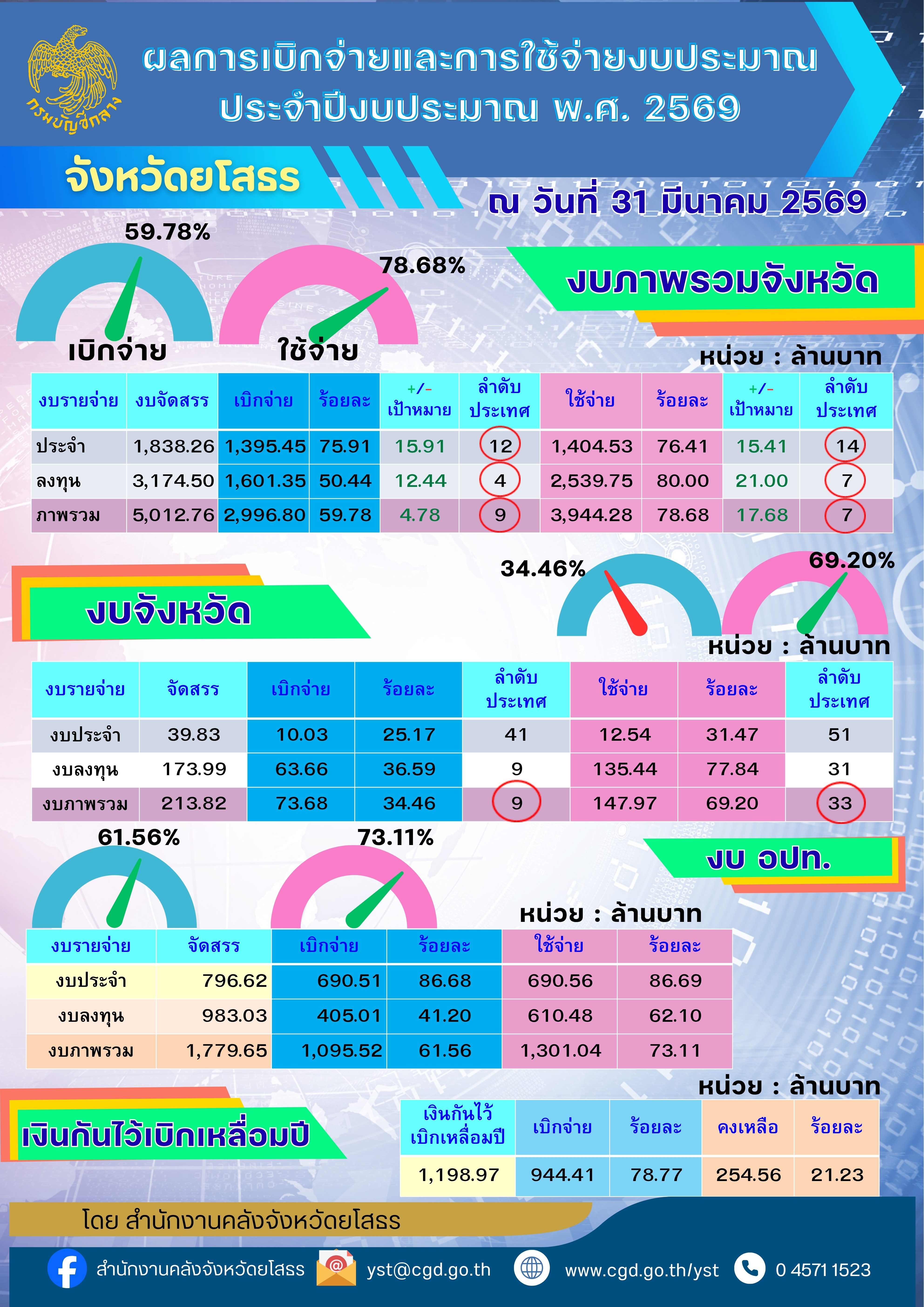 สำนักงานคลังจังหวัดยโสธร ขอรายงานผลการเบิกจ่ายและใช้จ่ายงบประมาณ ประจำปีงบประมาณ พ.ศ. 2569 จังหวัดยโสธร ณ วันที่ 31 มีนาคม 2569