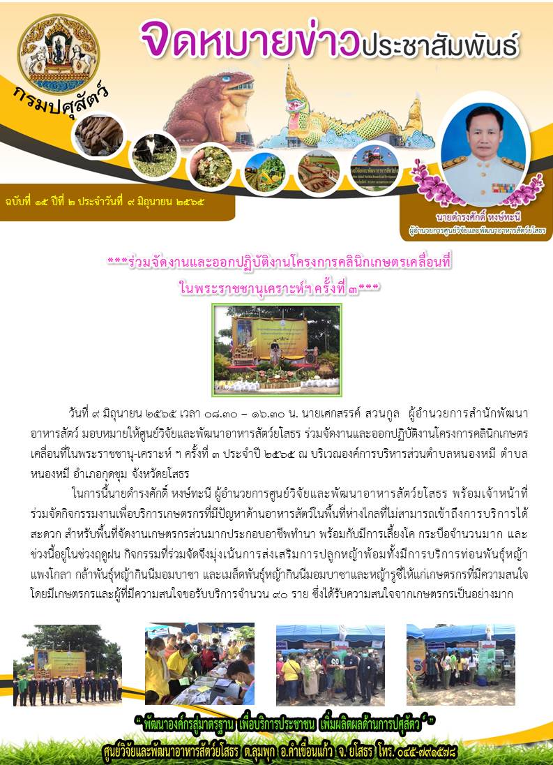 นายเศกสรรค์ สวนกูล ผู้อำนวยการสำนักพัฒนาอาหารสัตว์ มอบหมายให้ศูนย์วิจัยและพัฒนาอาหารสัตว์ยโสธร ร่วมจัดงานและออกปฏิบัติงานโครงการคลินิกเกษตรเคลื่อนที่ในพระราชชานุ-เคราะห์ ฯ ครั้งที่ ๓ ประจำปี ๒๕๖๕ ณ บริเวณองค์การบริหารส่วนตำบลหนองหมี ตำบลหนองหมี อำเภอกุดชุม จังหวัดยโสธร