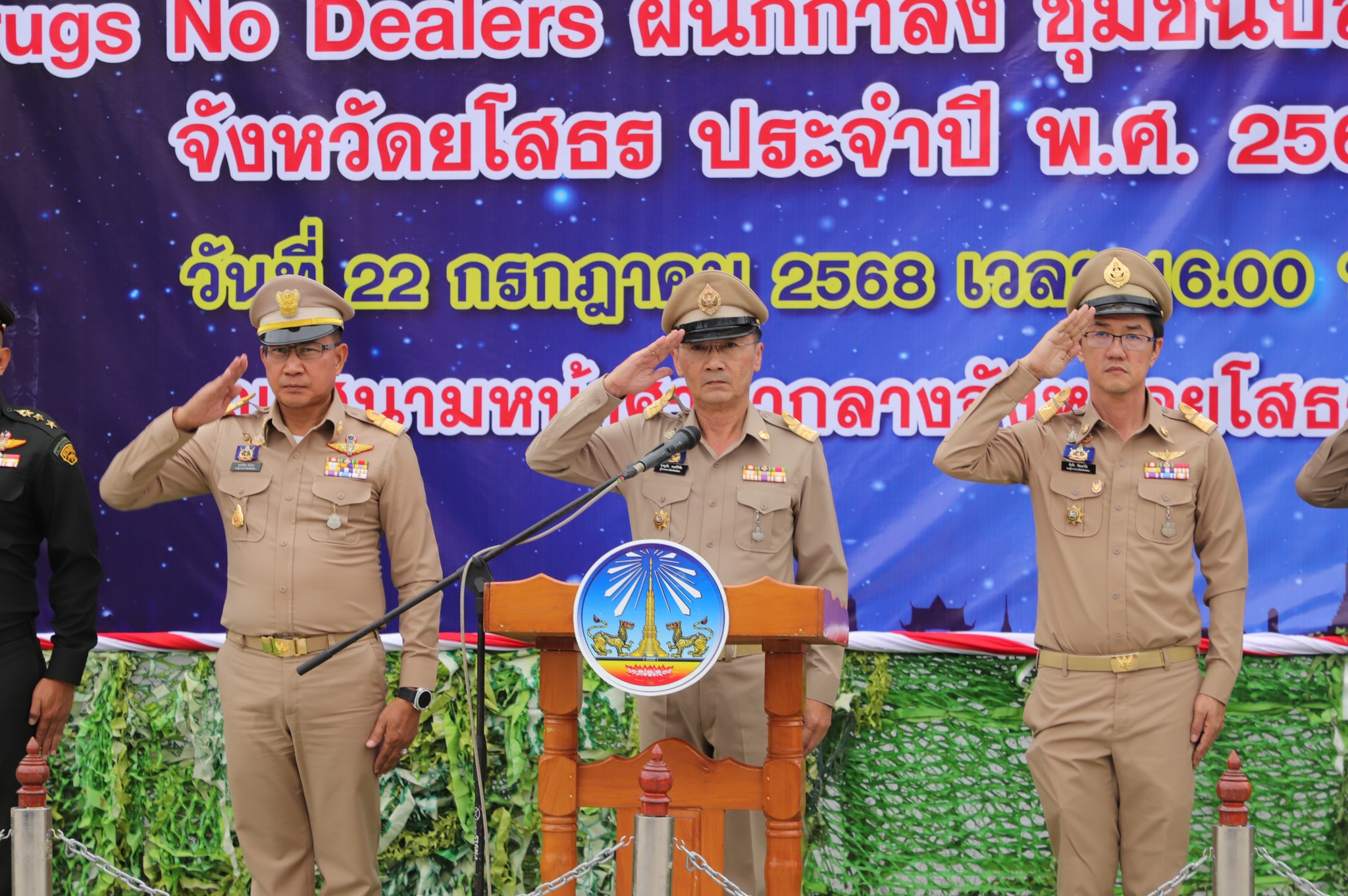 วันที่ 22 กรกฎาคม 2568 เวลา 16.00 น. ณ สนามหน้าศาลากลางจังหวัดยโสธร นายชาญชัย ศรศรีวิชัย ผู้ว่าราชการจังหวัดยโสธร เป็นประธานในพิธีปล่อยแถวเปิดปฏิบัติการกวาดล้างยาเสพติด "No Drugs No Dealers ผนึกกำลัง ชุมชนปลอดยาเสพติด" โดยมีนายสมชัย บูรณะ ปลัดจังหวัดยโสธร ในฐานะเลขานุการศูนย์อำนวยการป้องกันและปราบปรามยาเสพติดจังหวัดยโสธร (ศอ.ปส.จ.ยส.) กล่าวรายงาน พร้อมด้วย หัวหน้าส่วนราชการ และชุดปฏิบัติการจากหน่วยงานต่างๆ เข้าร่วมพิธีอย่างพร้อมเพรียง