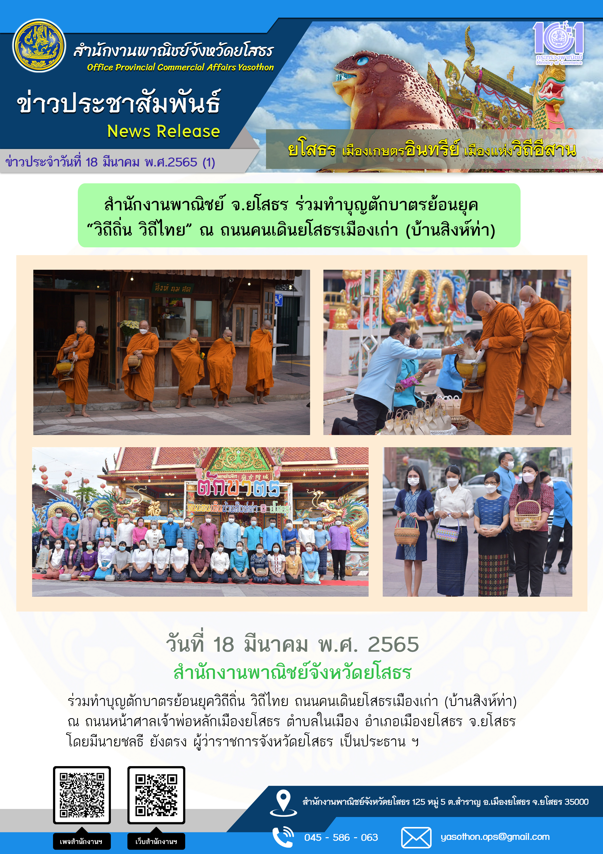 วันที่ 21 มี.ค. 2565 (09:22 น.)วันที่ 18 มีนาคม พ.ศ. 2565 สำนักงานพาณิชย์จังหวัดยโสธร ร่วมทำบุญตักบาตรย้อนยุควิถีถิ่น วิถีไทย ถนนคนเดินยโสธรเมืองเก่า (บ้านสิงห์ท่า) ณ ถนนหน้าศาลเจ้าพ่อหลักเมืองยโสธร ตำบลในเมือง อำเภอเมืองยโสธร จ.ยโสธร โดยมีนายชลธี ยังตรง ผู้ว่าราชการจังหวัดยโสธร เป็นประธาน ฯ