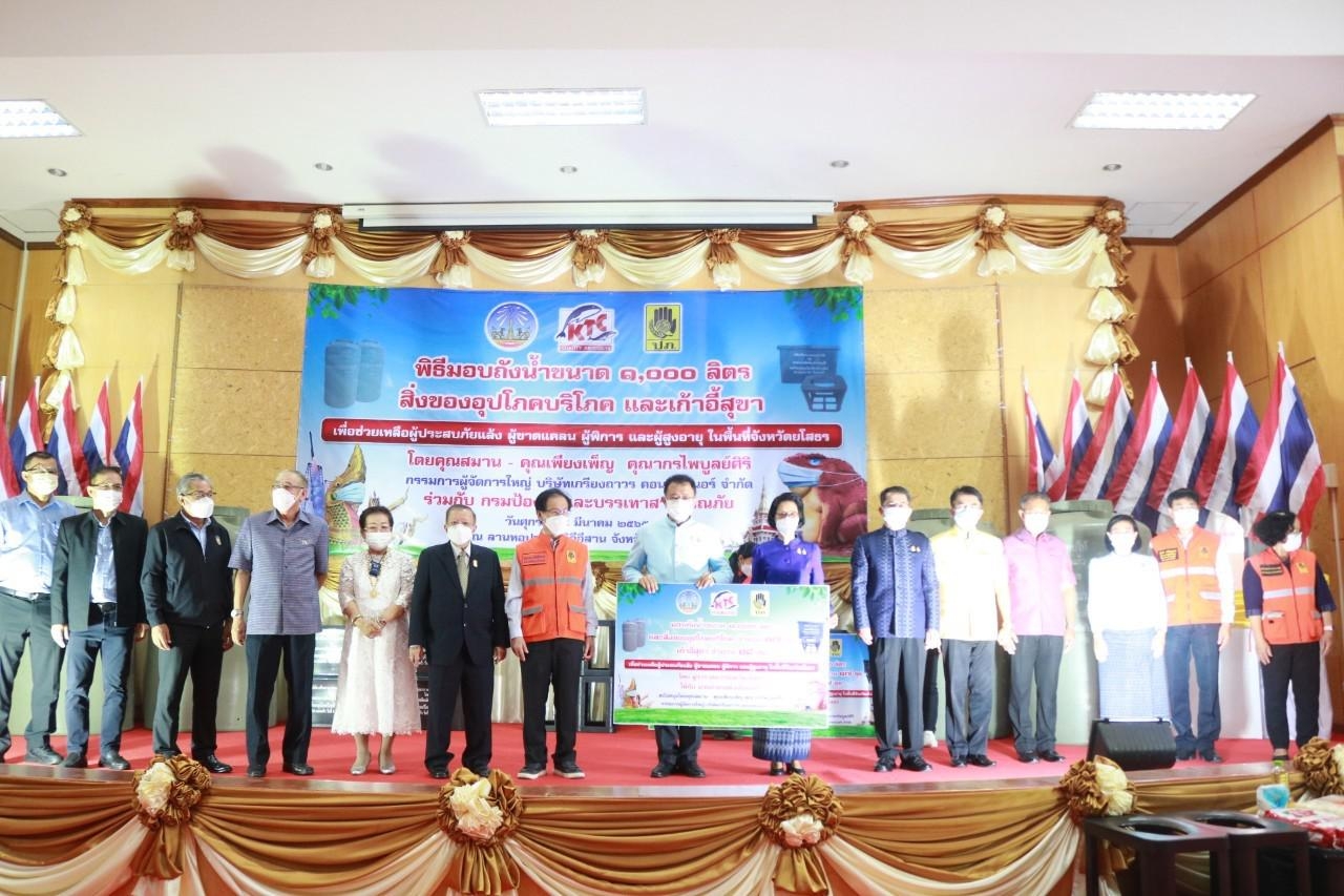 วันที่ 22 มี.ค. 2565 (15:19 น.)วันศุกร์ที่ ๑๘ มีนาคม ๒๕๖๕ เวลา ๑๐.๓๐ น. ณ หอประชุมวิถีอีสาน ศาลากลางจังหวัดยโสธร : นายชลธี ยังตรง ผู้ว่าราชการจังหวัดยโสธร กล่าวต้อนรับอธิบดีกรมป้องกันและบรรเทาสาธารณภัย และนายวิบูลย์ สงวนพงศ์ อดีตปลัดกระทรวงมหาดไทย พร้อมคณะ และคุณสมาน - คุณเพียงเพ็ญ คุณากรไพบูลย์ศิริ กรรมการผู้จัดการใหญ่ บริษัทเกรียงถาวร คอนเทนเนอร์ จำกัด และร่วมพิธีรับมอบถังน้ำขนาด ๑,๐๐๐ ลิตร สิ่งของอุปโภคบริโภค และเก้าอี้สุขา จำนวน ๑๕๐ ชุด ซึ่งสิ่งของที่จังหวัดได้รับจัดสรรจะมอบให้แก่อำเภอทั้ง ๙ อำเภอ ในพื้นที่จังหวัดยโสธร เพื่อนำไปใช้ในการช่วยเหลือและบรรเทาความเดือดร้อนของประชาชน ในการนี้ได้ตรวจความพร้อมของเจ้าหน้าที่บุคลากร เครื่องจักร เครื่องมือยานพาหนะ วัสดุอุปกรณ์ ที่จำเป็นเพื่อให้ความช่วยเหลือผู้ประสบภัยได้ทันทีเมื่อเกิดภัย โดยมีรองผู้ว่าราชการจังหวัด ปลัดจังหวัด หัวหน้าส่วนราชการ นายอำเภอ พี่น้องประชาชน เข้าร่วมในพิธี