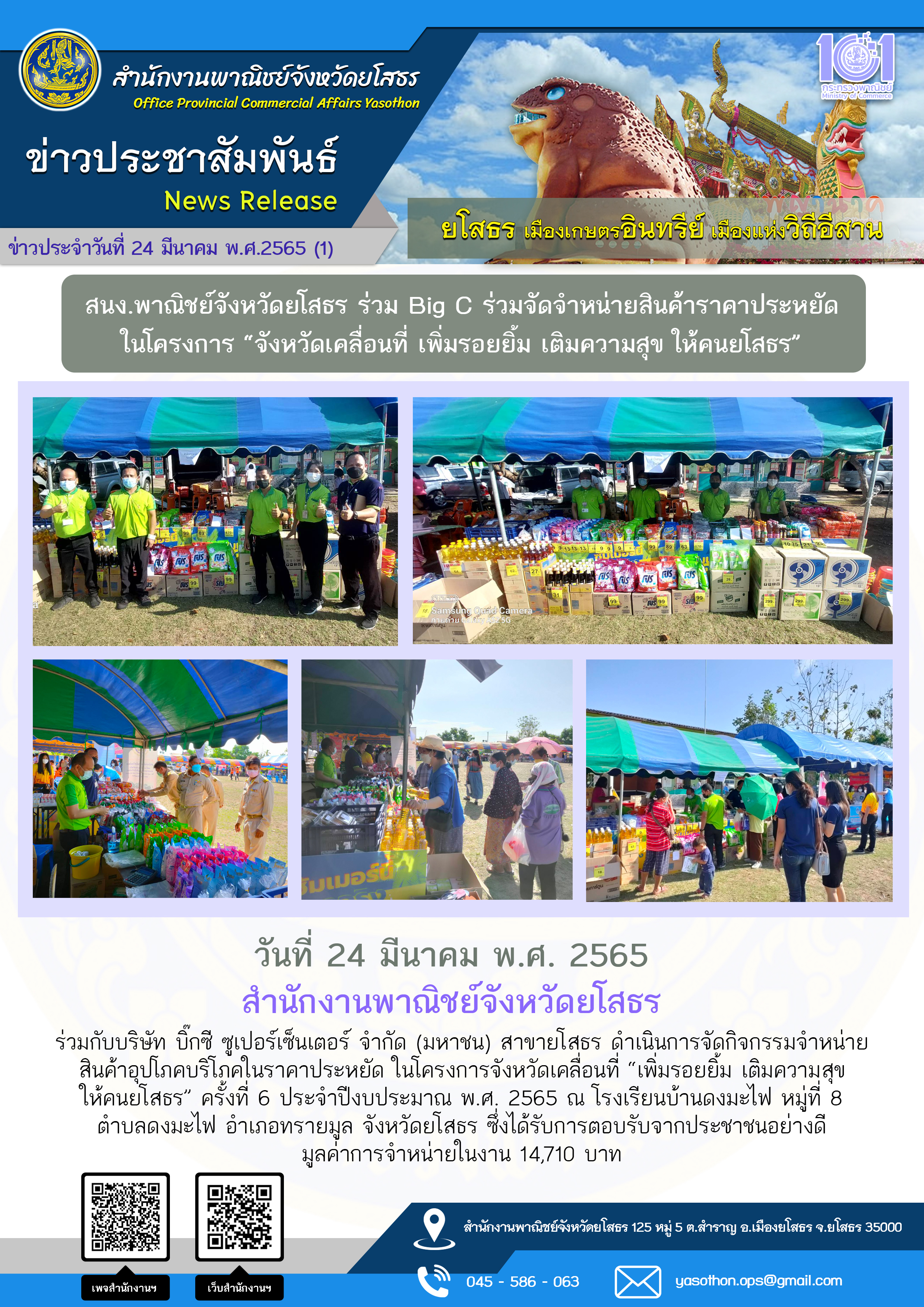 วันที่ 25 มี.ค. 2565 (09:02 น.)วันที่ 24 มีนาคม พ.ศ. 2565 สำนักงานพาณิชย์จังหวัดยโสธร ร่วมกับบริษัท บิ๊กซี ซูเปอร์เซ็นเตอร์ จำกัด (มหาชน) สาขายโสธร ดำเนินการจัดกิจกรรมจำหน่ายสินค้าอุปโภคบริโภคในราคาประหยัด ในโครงการจังหวัดเคลื่อนที่ "เพิ่มรอยยิ้ม เติมความสุข ให้คนย์โสธร" ครั้งที่ 6 ประจำปีงบประมาณ พ.ศ. 2565 ณ โรงเรียนบ้านดงมะไฟ หมู่ที่ 8 ตำบลดงมะไฟ อำเภอทรายมูล จังหวัดยโสธร ซึ่งได้รับการตอบรับจากประชาชนอย่างดี มูลค้ำาการจำหน่ายในงาน 14,710 บาท