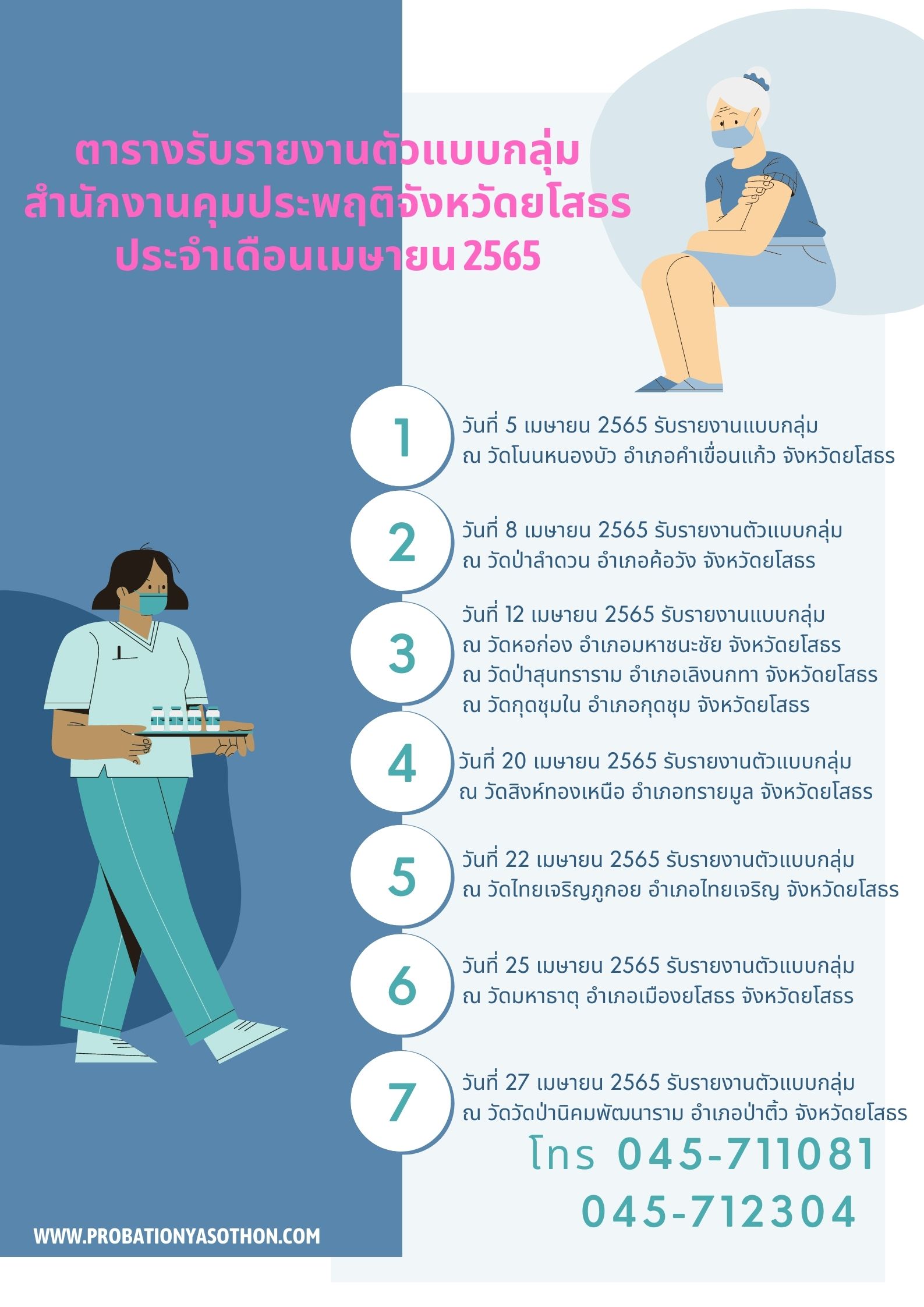 วันที่ 5 เม.ย. 2565 (14:23 น.)สำนักงานคุมประพฤติจังหวัดยโสธร กำหนดตารางออกรับรายงานตัวตามศูนย์ประสานงานอาสาสมัครคุมประพฤติตามเขตอำเภอดังนี้