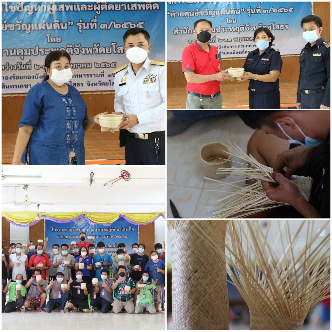 วันที่ 15 พ.ค. 2565 (07:09 น.)กรมคุมประพฤติ กระทรวงยุติธรรม โดยสำนักงานคุมประพฤติจังหวัดยโสธร จัดค่ายศูนย์ขวัญแผ่นดินรุ่นที่ 3 ประจำปีงบประมาณ 2565 ขึ้นระหว่างวันที่ 2 พฤษภาคม 2565 ถึง วันที่ 13 พฤษภาคม 2565 โดยกิจกรรมวันที่ 12 พฤษภาคม 2465 มีกลุ่มแม่บ้านบ้านดอนกลอง ตำบลหนองเรือ อำเภอเมืองยโสธร จังหวัดยโสธร ได้ให้ความรู้เกี่ยวกับการฝึกทักษะอาชีพเป็นวันที่ 2 “การจักสานหวดซิ่งนึ่งข้าวเหนียว” เพื่อให้ผู้เข้ารับการฝึกอบรมได้สามารถนำไปประกอบอาชีพต่อไป ซึ่งการจัดกิจกรรมดังกล่าวได้ปฏิบัติภายใต้มาตรการป้องกันการแพร่ระบาดของเชื้อไวรัสโคโรนา ( COVID – 19 ) ณ กองร้อยกองบังคับการ กรมทหารราบที่ 16 ค่ายบดินทรเดชา อำเภอเมืองยโสธร จังหวัดยโสธร
