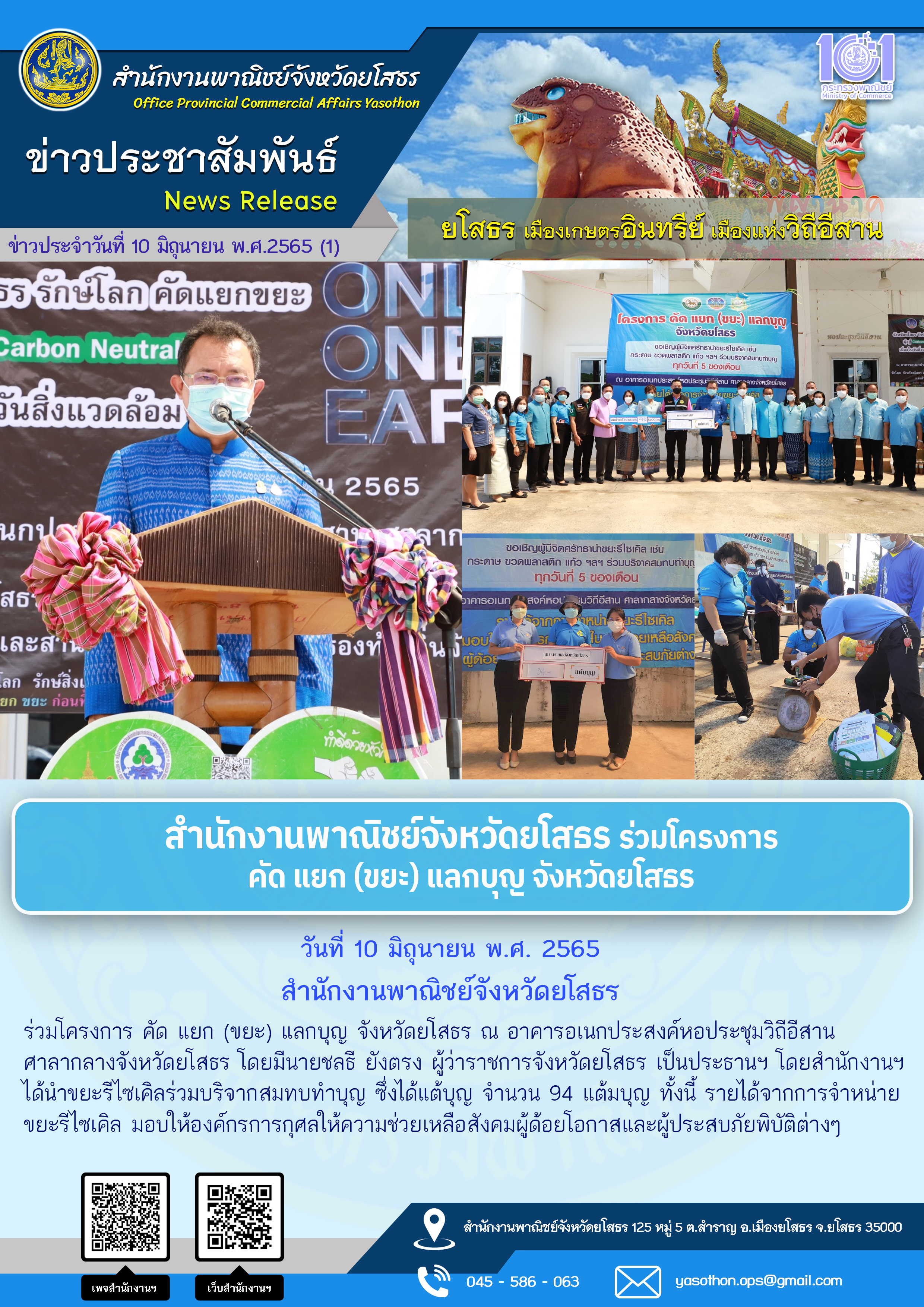 วันที่ 13 มิ.ย. 2565 (09:04 น.)วันที่ 10 มิถุนายน พ.ศ. 2565 สำนักงานพาณิชย์จังหวัดยโสธร ร่วมโครงการ คัด แยก (ขยะ) แลกบุญ จังหวัดยโสธร ณ อาคารอเนกประสงค์หอประชุมวิถีอีสานศาลากลางจังหวัดยโสธร โดยมีนายชลธี ยังตรง ผู้ว่าราชการจังหวัดยโสธร เป็นประธานฯ โดยสำนักงานฯ ได้นำขยะรีไซเคิลร่วมบริจากสมทบทำบุญ ซึ่งได้แต้บุญ จำนวน 94 แต้มบุญ ทั้งนี้ รายได้จากการจำหน่ายขยะรีไซเคิล มอบให้องค์กรการกุศลให้ความช่วยเหลือสังคมผู้ด้อยโอกาสและผู้ประสบภัยพิบัติต่างๆ
