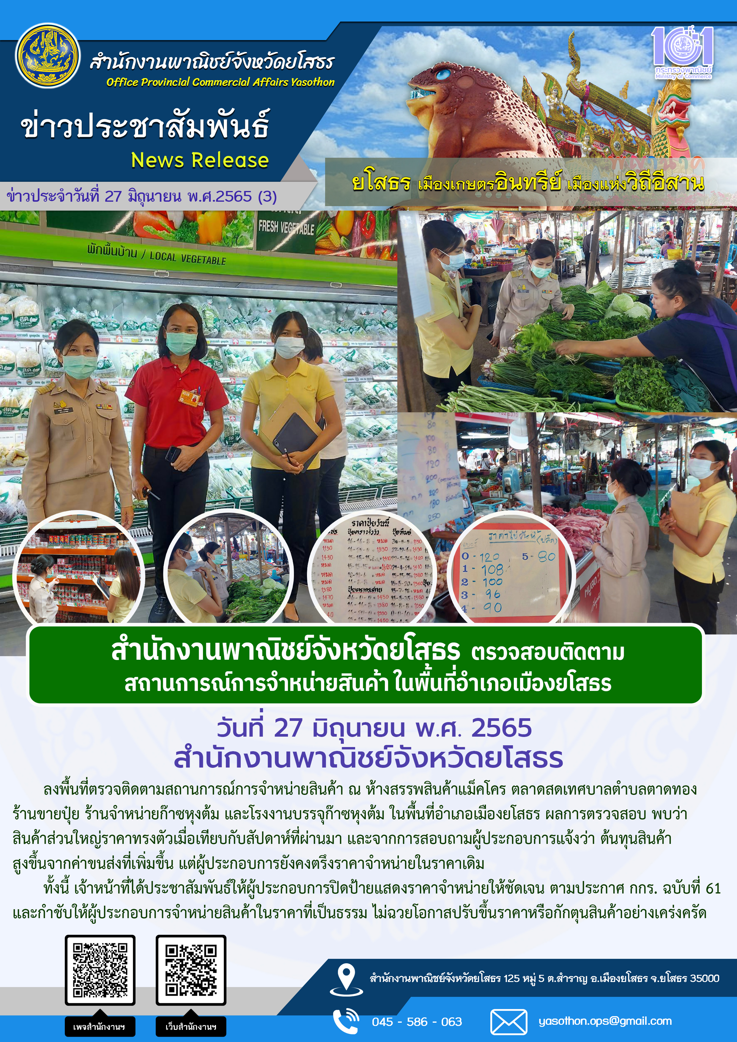 วันที่ 28 มิ.ย. 2565 (13:40 น.)วันที่ 27 มิถุนายน พ.ศ. 2565 สำนักงานพาณิชย์จังหวัดยโสธร ลงพื้นที่ตรวจติดตามสถานการณ์การจำหน่ายสินค้า ณ ห้างสรรพสินค้าแม็คโคร ตลาดสดเทศบาลตำบลตาดทองร้านขายปุ้ย ร้านจำหน่ายก๊าซหุงต้ม และโรงงานบรรจุก๊ซหุงต้ม ในพื้นที่อำเภอเมืองยโสธร ผลการตรวจสอบ พบว่า สินค้าส่วนใหญ่ราคาทรงตัวเมื่อเทียบกับสัปดาห์ที่ผ่านมา และจากการสอบถามผู้ประกอบการแจ้งว่า ต้นทุนสินค้าสูงขึ้นจากค่าขนส่งที่เพิ่มขึ้น แต่ผู้ประกอบการยังคงตรึงราคาจำหน่ายในราคาเดิม ทั้งนี้ เจ้าหน้าที่ได้ประชาสัมพันธ์ให้ผู้ประกอบการปิดป้ายแสดงราคาจำหน่ายให้ชัดเจน ตามประกาศ กกร. ฉบับที่ 61 และกำชับให้ผู้ประกอบการจำหน่ายสินค้าในราคาที่เป็นธรรม ไม่ฉวยโอกาสปรับขึ้นราคาหรือกักตุนสินค้าอย่างเคร่งครัด