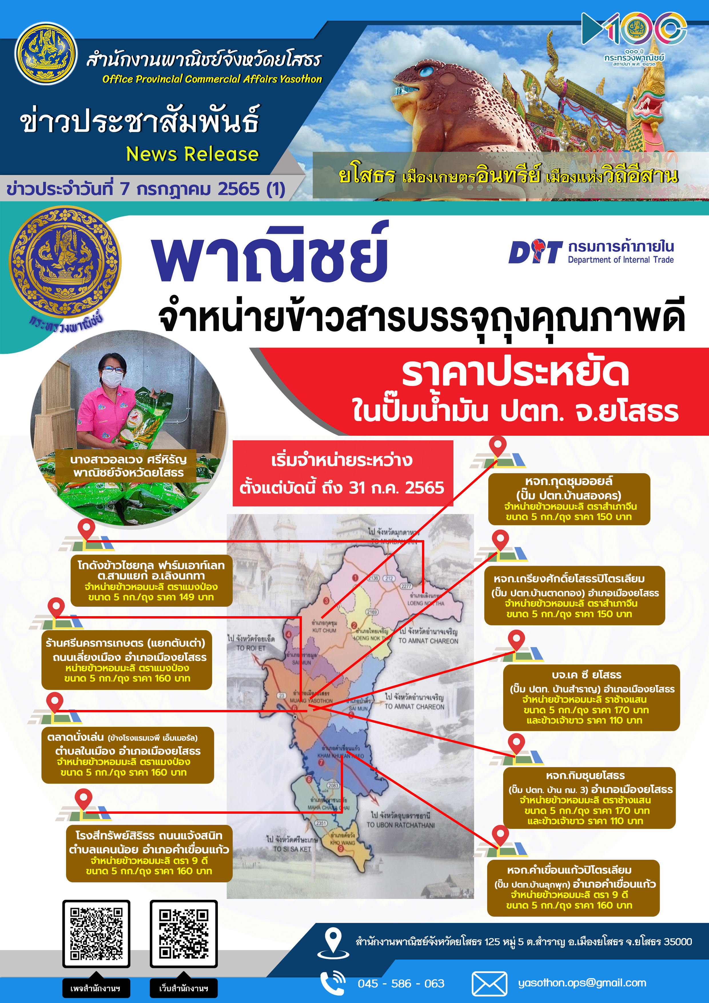 วันที่ 5 กรกฎาคม 2565 สำนักงานพาณิชย์จังหวัดยโสธร โดยนางสาวอลเวง ศรีหิรัญ พาณิชย์จังหวัดยโสธร พร้อมด้วยเจ้าหน้าที่ลงพื้นที่ตรวจเยี่ยมผู้ประกอบการที่เข้าร่วมกิจกรรม “พาณิชย์จำหน่ายข้าวสารบรรจุถุงคุณภาพดีราคาประหยัด” เริ่มจำหน่ายตั้งแต่บัดนี้ ถึง 31 กรกฎาคม 2565 เพื่อช่วยลดค่าครองชีพให้กับประชาชนไม่ให้ได้รับผลกระทบจากสถานการณ์