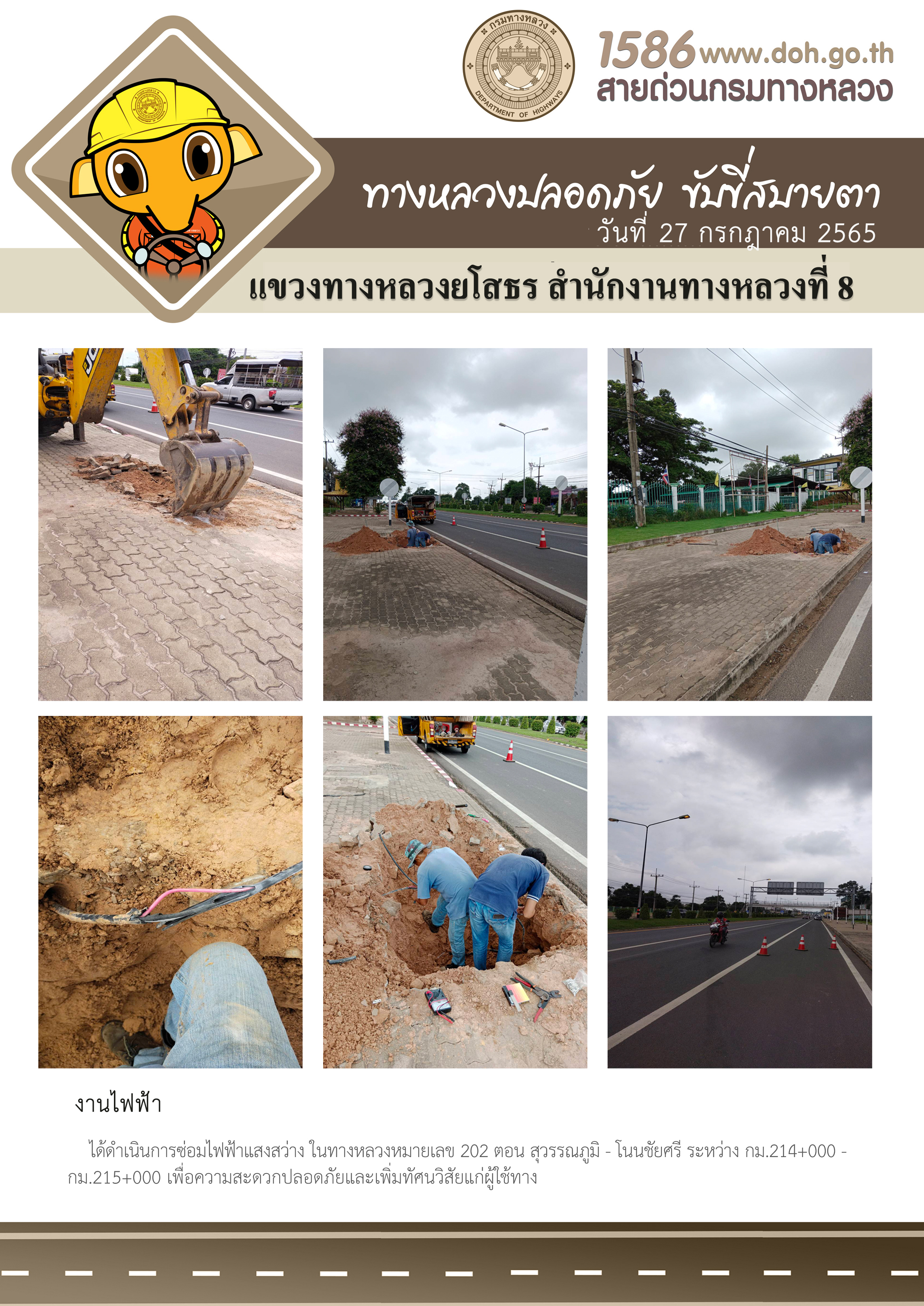 วันที่ 27 กรกฎาคม 2565 งานไฟฟ้า ได้ดำเนินการซ่อมไฟฟ้าแสงสว่าง ในทางหลวงหมายเลข 202 ตอน สุวรรณภูมิ - โนนชัยศรี ระหว่าง กม.214+000 - กม.215+000 เพื่อความสะดวกปลอดภัยและเพิ่มทัศนวิสัยแก่ผู้ใช้ทาง