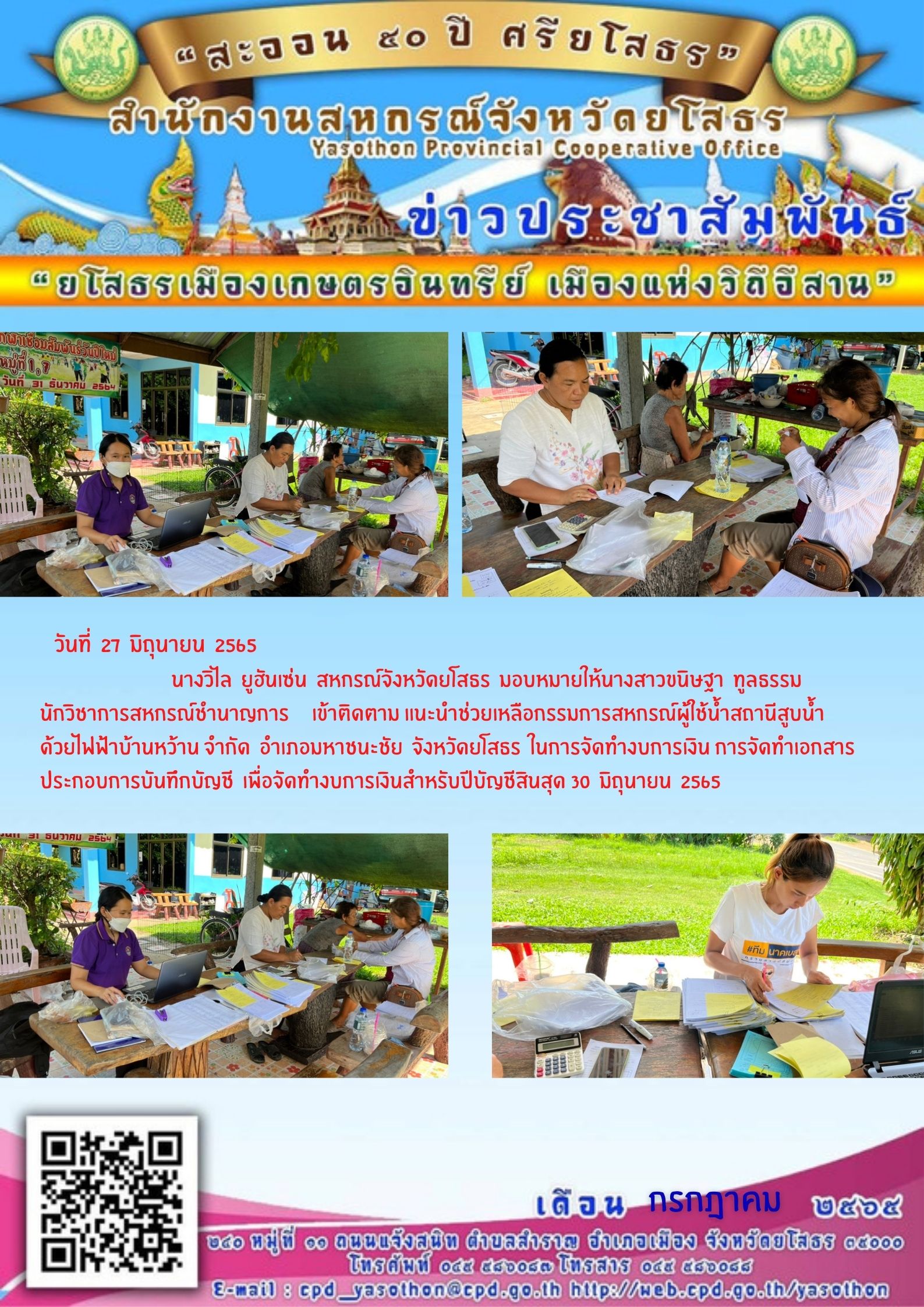 นางสาวขนิษฐา ทูลธรรม นักวิชาการสหกรณ์ชำนาญการ เข้าติดตาม แนะนำช่วยเหลือกรรมการสหกรณ์ผู้ใช้น้ำสถานีสูบน้ำด้วยไฟฟ้าบ้านหว้าน จำกัด อำเภอมหาชนะชัย จังหวัดยโสธร ในการจัดทำงบการเงินการจัดทำเอกสารประกอบการบันทึกบัญชี