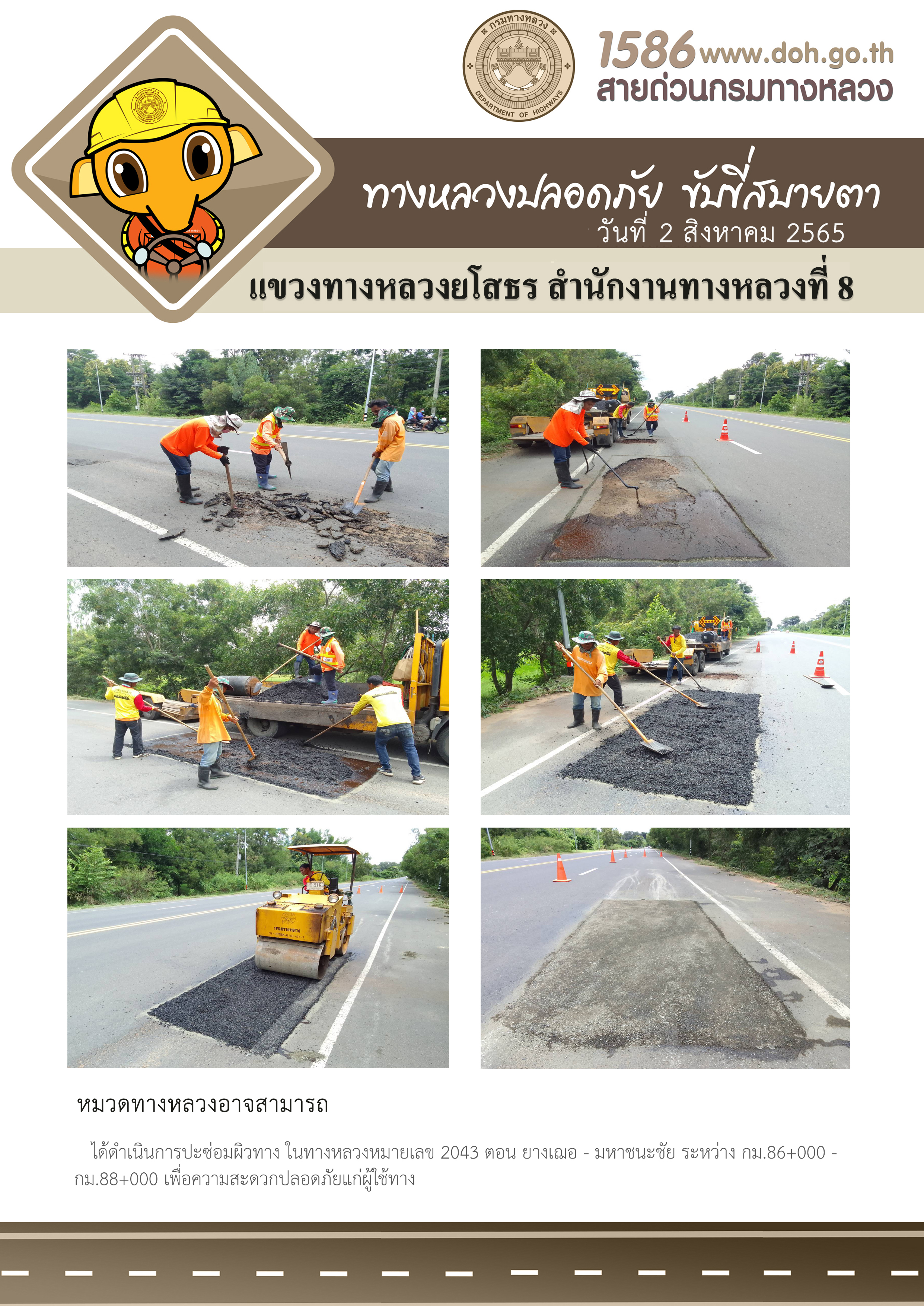 วันที่ 2 สิงหาคม 2565 หมวดทางหลวงอาจสามารถ ได้ดำเนินการปะซ่อมผิวทาง ในทางหลวงหมายเลข 2043 ตอน ยางเฌอ - มหาชนะชัย ระหว่าง กม.86+000 - กม.88+000 เพื่อความสะดวกปลอดภัยแก่ผู้ใช้ทาง