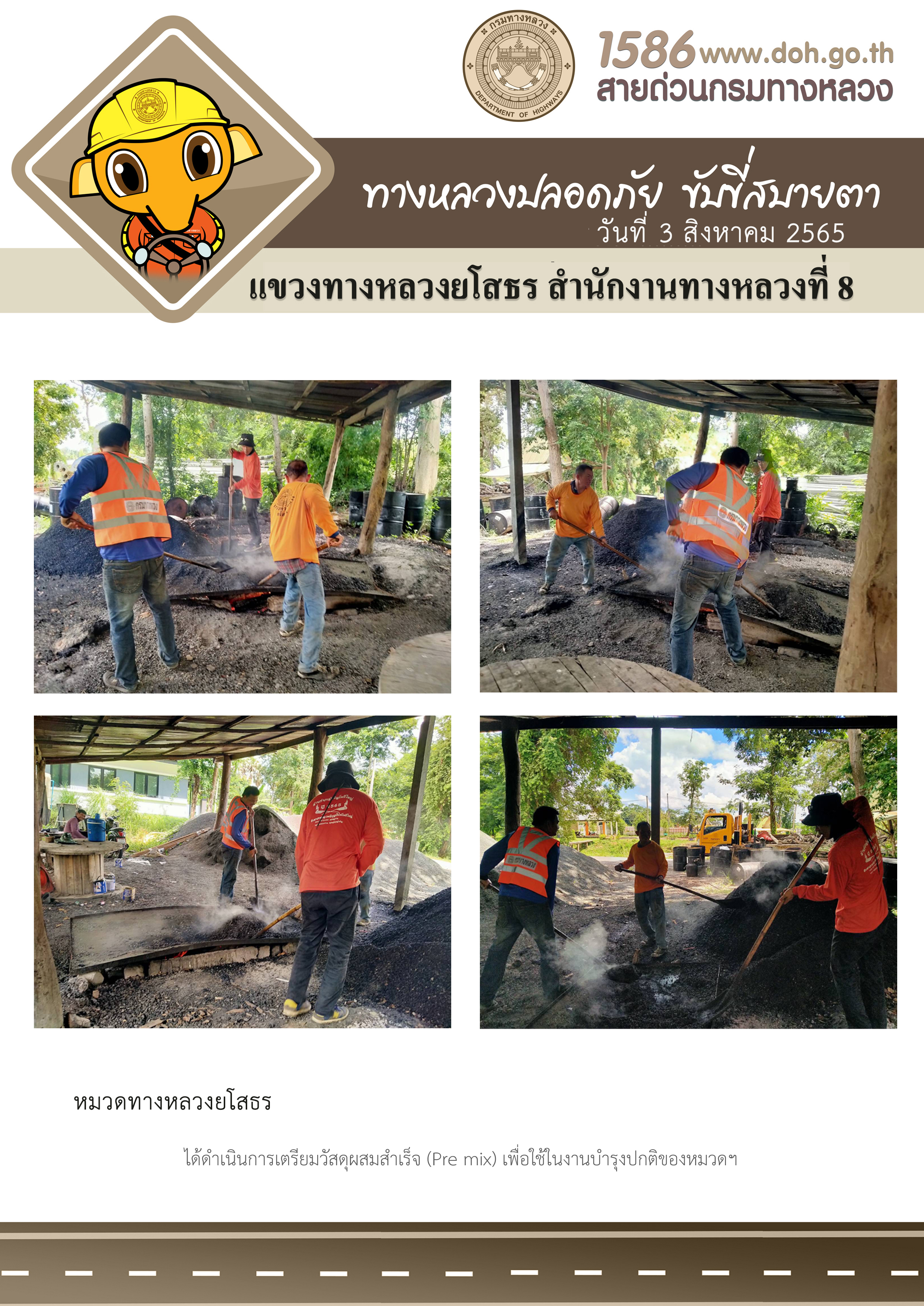 วันที่ 3 สิงหาคม 2565 หมวดทางหลวงยโสธร ได้ดำเนินการเตรียมวัสดุผสมสำเร็จ (Pre mix) เพื่อใช้ในงานบำรุงปกติของหมวดฯ