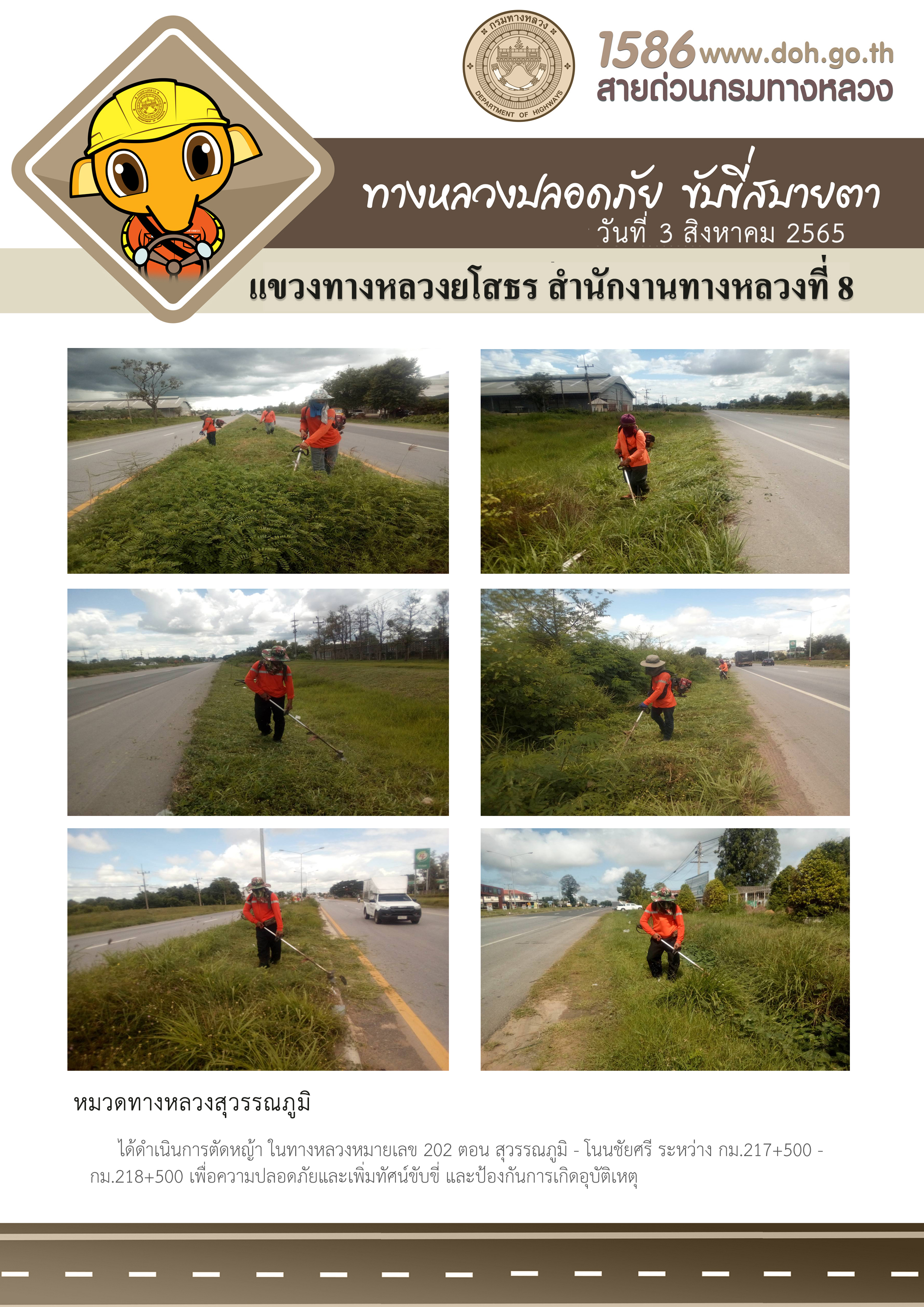 วันที่ 3 สิงหาคม 2565 หมวดทางหลวงสุวรรณภูมิ ได้ดำเนินการตัดหญ้า ในทางหลวงหมายเลข 202 ตอน สุวรรณภูมิ - โนนชัยศรี ระหว่าง กม.217+500 - กม.218+500 เพื่อความปลอดภัยและเพิ่มทัศน์ขับขี่ และป้องกันการเกิดอุบัติเหตุ