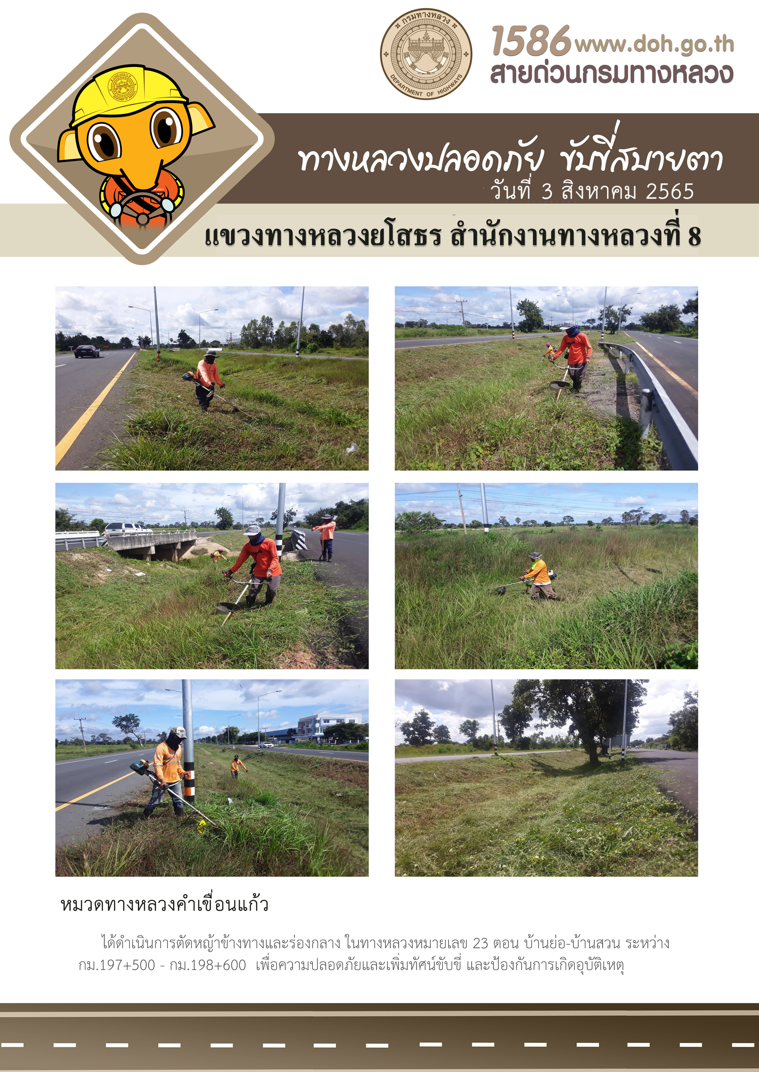 วันที่ 3 สิงหาคม 2565 หมวดทางหลวงคำเขื่อนแก้ว ได้ดำเนินการตัดหญ้าข้างทางและร่องกลาง ในทางหลวงหมายเลข 23 ตอน บ้านย่อ-บ้านสวน ระหว่าง กม.197+500 - กม.198+600 เพื่อความปลอดภัยและเพิ่มทัศน์ขับขี่ และป้องกันการเกิดอุบัติเหตุ