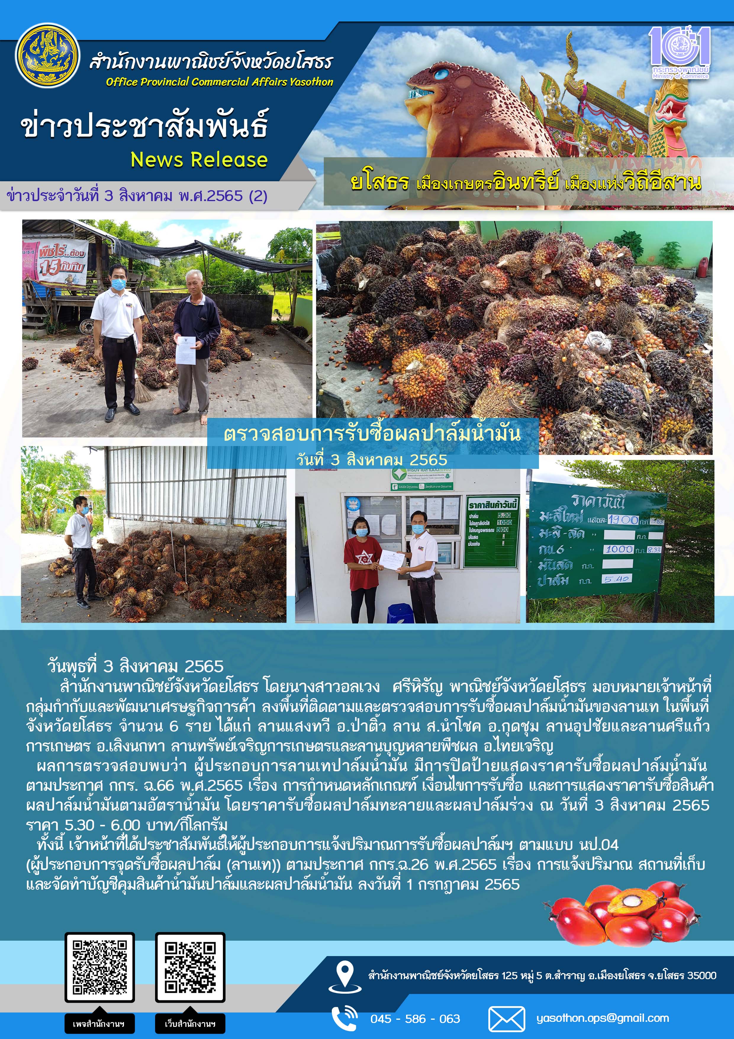 วันที่ 4 ส.ค. 2565 (11:31 น.)วันพุธที่ 3 สิงหาคม 2565 สำนักงานพาณิชย์จังหวัดยโสธร โดยนางสาวอลเวง ศรีหิรัญ พาณิชย์จังหวัดยโสธร มอบหมายเจ้าหน้าที่ กลุ่มกำกับและพัฒนาเศรษฐกิจการค้า ลงพื้นที่ติดตามและตรวจสอบการรับซื้อผลปาล์มน้ำมันของลานเท ในพื้นที่จังหวัดยโสธร จำนวน 6 ร้าย ได้แก่ ลานแสงหวี อ.ป่าติ๋ว ลาน ส.นำโชค อ.กุดชุม ลานอุปชัยและลานศรีแก้วการเกษตร อ.เลิงนกทา ลานทรัพย์เจริญการเกษตรและลานบุญหลายพีชผล อ.ไทยเจริญ ผลการตรวจสอบพบว่า ผู้ประกอบการลานเทปาล์มน้ำมัน มีการปิดป่ายแสดงราคารับซื้อผลปาลัมน้ำมันตามประกาศ กกร. ฉ.66 พ.ศ.2565 เรื่อง การกำหนดหลักเกณฑ์ เงื่อนไขการรับซื้อ และการแสดงราคารับซื้อสินค้าผลปาล์มน้ำมันตามอัตราน้ำมัน โดยราคารับซื้อผลปาล์มทะลายและผลปาล์มร่วง ณ วันที่ 3 สิงหาคม 2565 ราคา 5.30 - 6.00 บาท/กิโลกรัม ทั้งนี้ เจ้าหน้าที่ได้ประชาสัมพันธ์ให้ผู้ประกอบการแจ้งปริมาณการรับซื้อผลปาล์มฯ, ตามแบบ นป.04 ผู้ประกอบการจุดรับซื้อผลปาล์ม (ลานเท) ตามประกาศ กกร.ฉ.26 พ.ศ.2565 เรื่อง การแจ้งปริมาณ สถานที่เก็บและจัดทำบัญชีคุมสินค้าน้ำมันปาล์มและผลปาล์มน้ำมัน