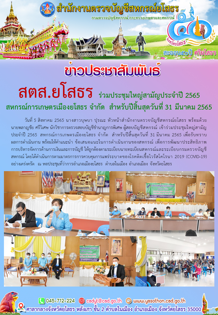 สตส.ยโสธร ร่วมประชุมใหญ่สามัญประจำปี 2565 สหกรณ์การเกษตรเมืองยโสธร จำกัด สำหรับปีสิ้นสุดวันที่ 31 มีนาคม 2565