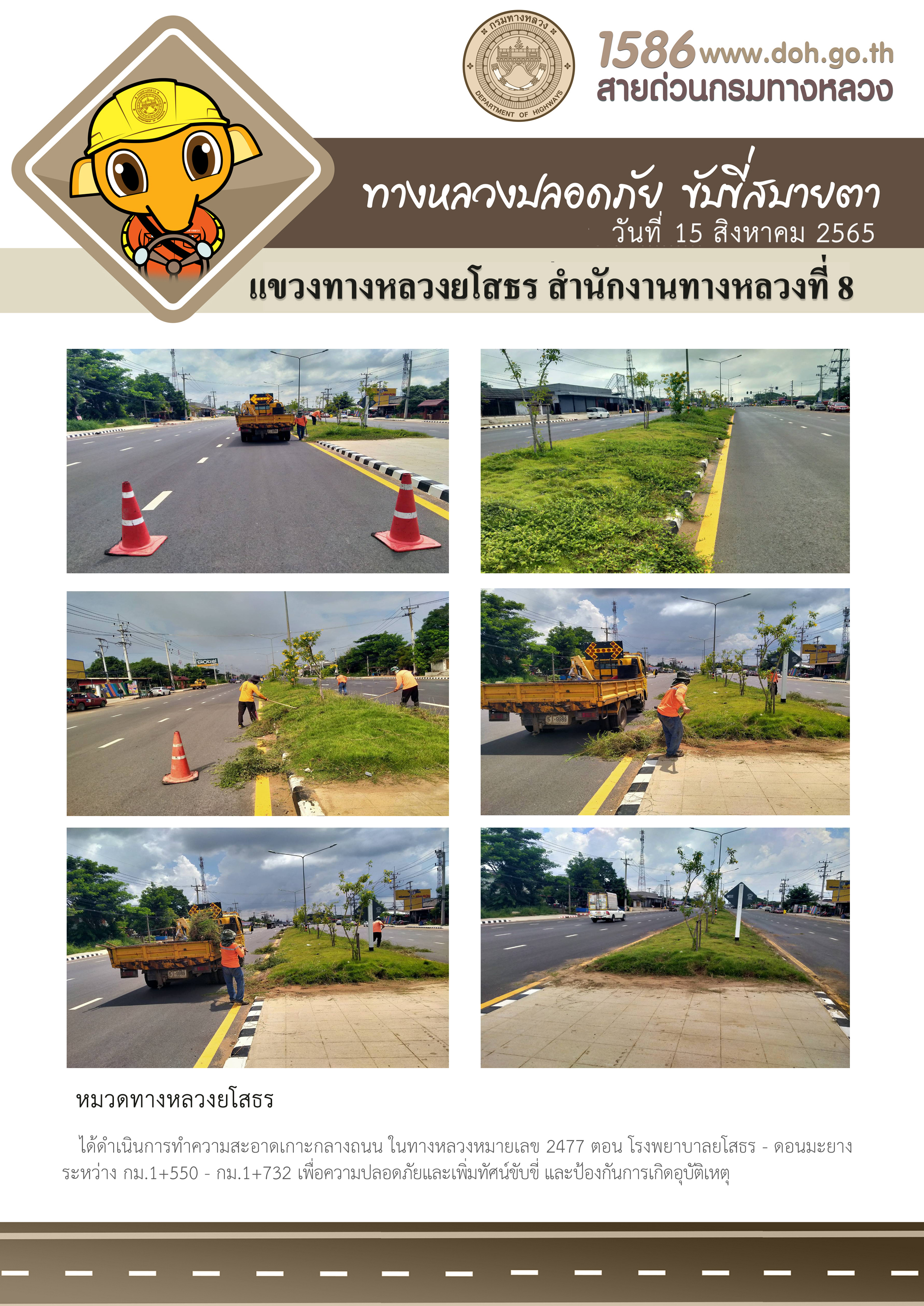 วันที่ 15 สิงหาคม 2565 หมวดทางหลวงยโสธร ได้ดำเนินการทำความสะอาดเกาะกลางถนน ในทางหลวงหมายเลข 2477 ตอน โรงพยาบาลยโสธร - ดอนมะยาง ระหว่าง กม.1+550 - กม.1+ 732 เพื่อความปลอดภัยและเพิ่มทัศน์ขับขี่ และป้องกันการเกิดอุบัติเหตุ