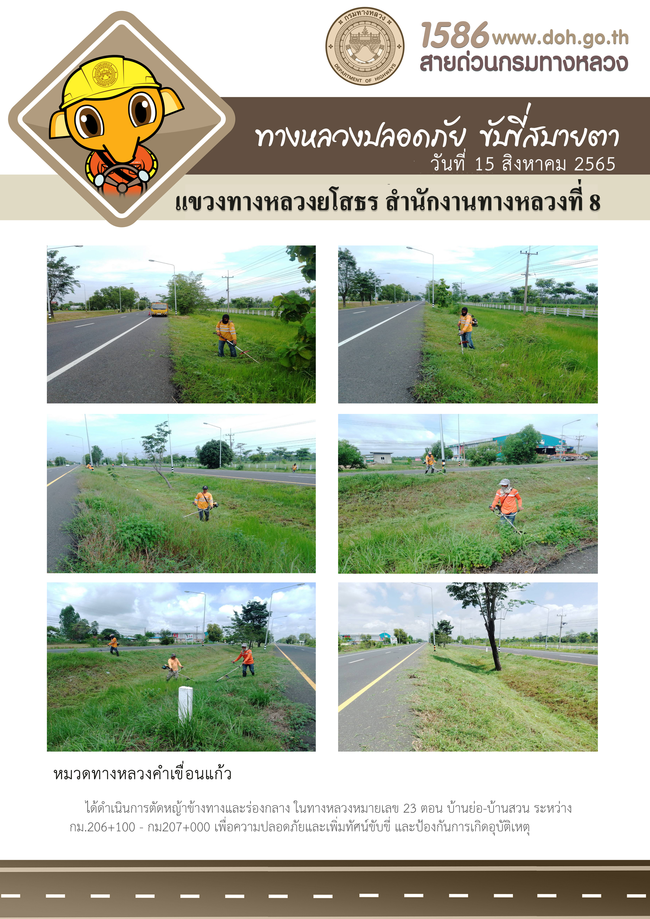 วันที่ 15 สิงหาคม 2565 หมวดทางหลวงคำเขื่อนแก้ว ได้ดำเนินการตัดหญ้าข้างทางและร่องกลาง ในทางหลวงหมายเลข 23 ตอน บ้านย่อ-บ้านสวน ระหว่าง กม.206+100 - กม207+000 เพื่อความปลอดภัยและเพิ่มทัศน์ขับขี่ และป้องกันการเกิดอุบัติเหตุ