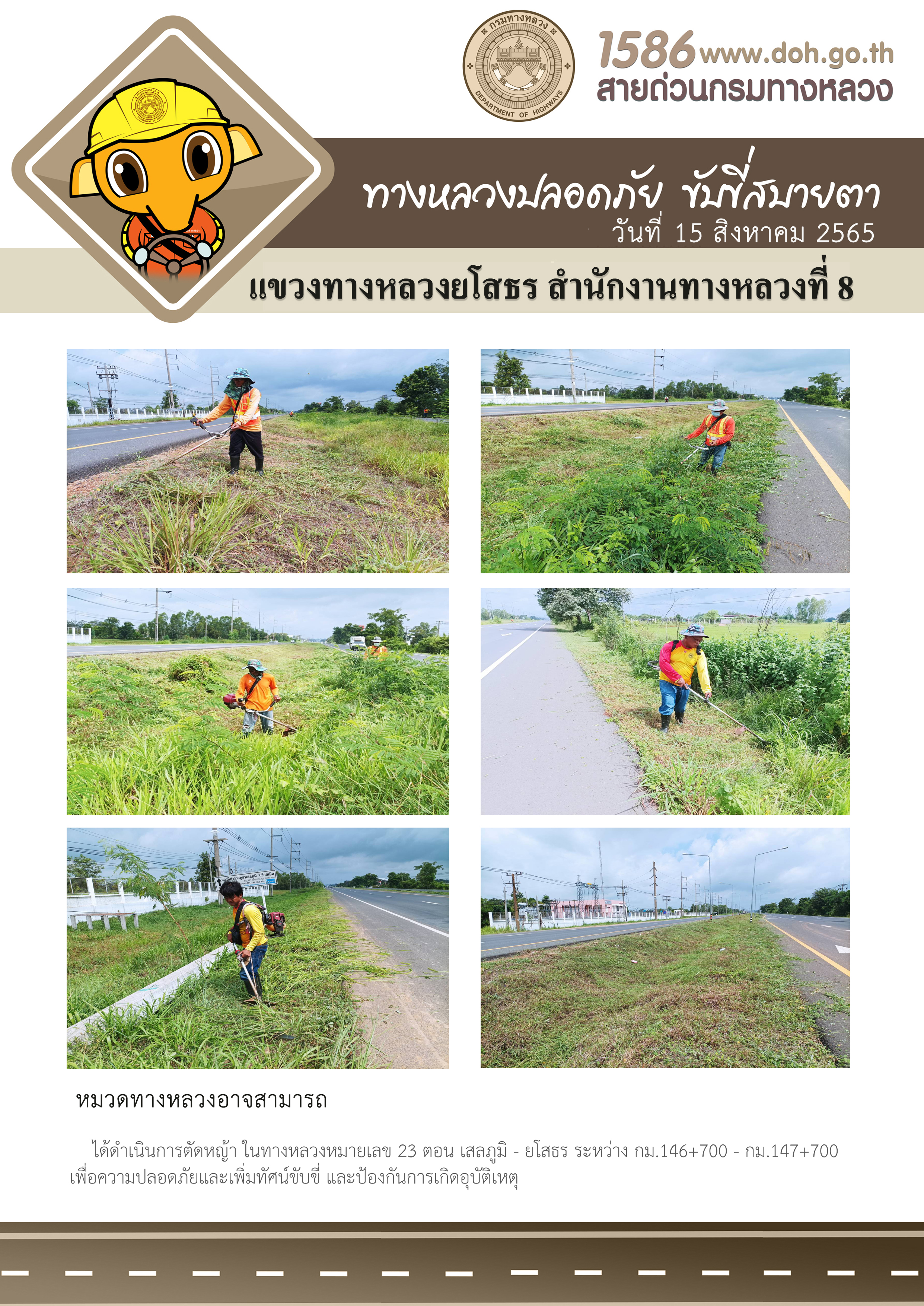 วันที่ 15 สิงหาคม 2565 หมวดทางหลวงอาจสามารถ ได้ดำเนินการตัดหญ้า ในทางหลวงหมายเลข 23 ตอน เสลภูมิ - ยโสธร ระหว่าง กม.146+700 - กม.147+700 เพื่อความปลอดภัยและเพิ่มทัศน์ขับขี่ และป้องกันการเกิดอุบัติเหตุ