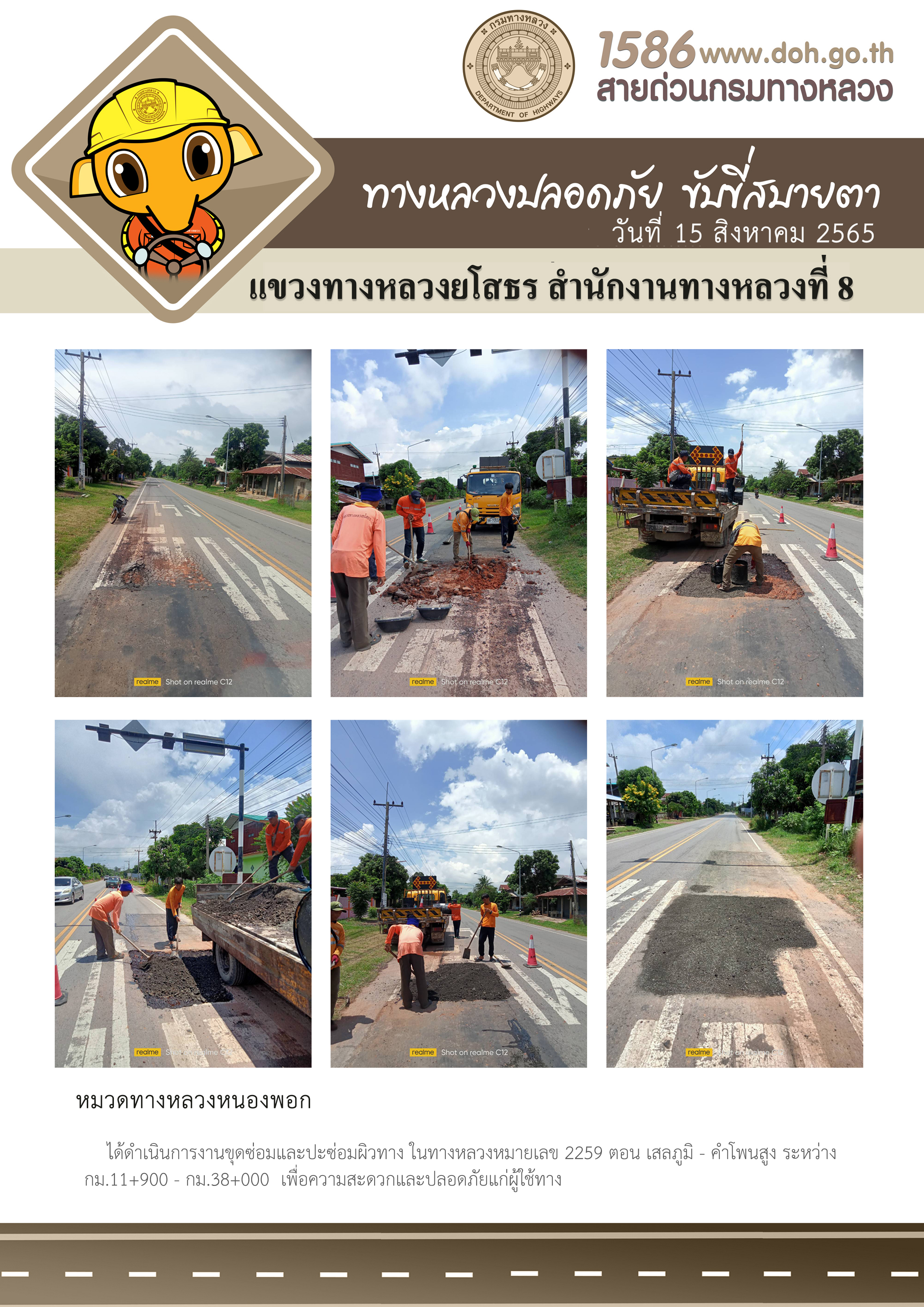 วันที่ 15 สิงหาคม 2565 หมวดทางหลวงหนองพอก ได้ดำเนินการงานขุดซ่อมและปะซ่อมผิวทาง ในทางหลวงหมายเลข 2259 ตอน เสลภูมิ - คำโพนสูง ระหว่าง กม.11+900 - กม.38+000 เพื่อความสะดวกและปลอดภัยแก่ผู้ใช้ทาง