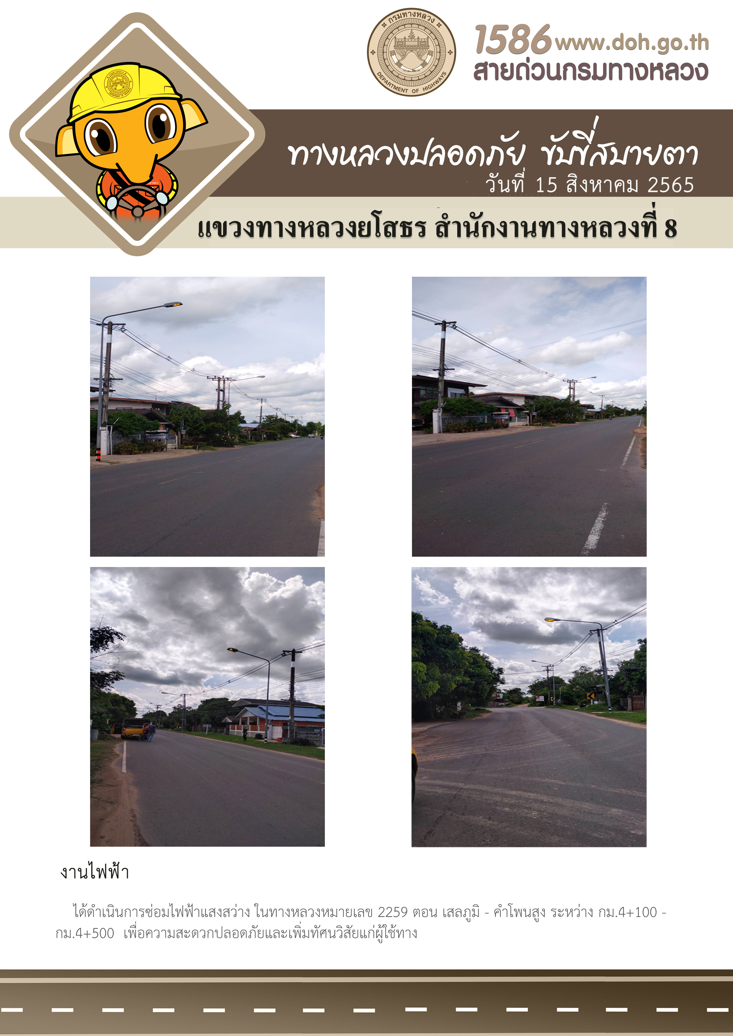 วันที่ 15 สิงหาคม 2565 งานไฟฟ้า ได้ดำเนินการซ่อมไฟฟ้าแสงสว่าง ในทางหลวงหมายเลข 2259 ตอน เสลภูมิ - คำโพนสูง ระหว่าง กม.4+100 - กม.4+500 เพื่อความสะดวกปลอดภัยและเพิ่มทัศนวิสัยแก่ผู้ใช้ทาง