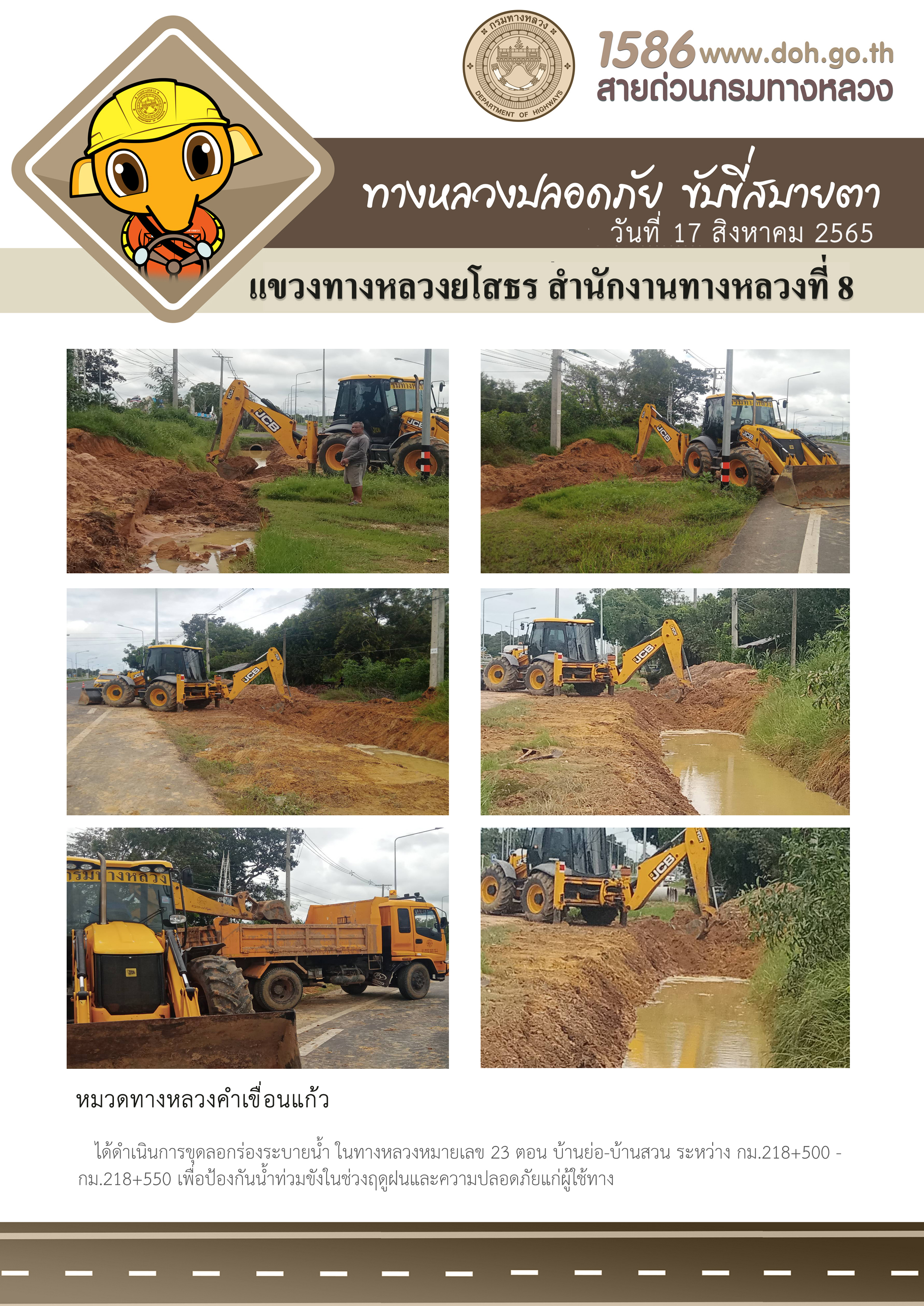 วันที่ 17 สิงหาคม 2565 หมวดทางหลวงคำเขื่อนแก้ว ได้ดำเนินการขุดลอกร่องระบายน้ำ ในทางหลวงหมายเลข 23 ตอน บ้านย่อ-บ้านสวน ระหว่าง กม.218+500 - กม.218+550 เพื่อป้องกันน้ำท่วมขังในช่วงฤดูฝนและความปลอดภัยแก่ผู้ใช้ทาง