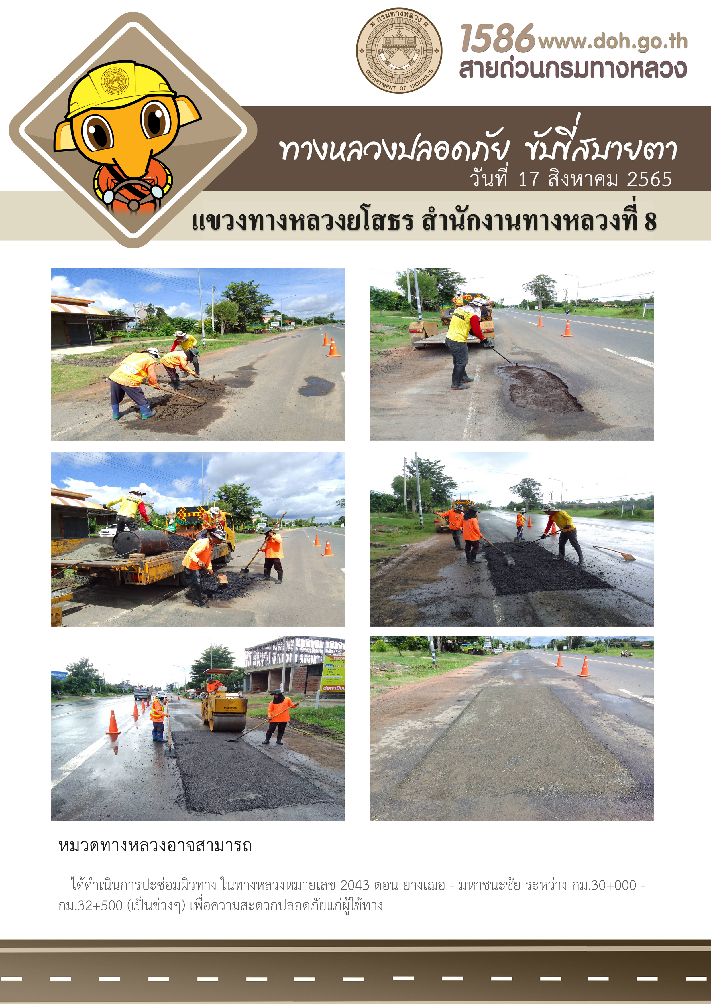 วันที่ 17 สิงหาคม 2565 หมวดทางหลวงอาจสามารถ ได้ดำเนินการปะซ่อมผิวทาง ในทางหลวงหมายเลข 2043 ตอน ยางเฌอ - มหาชนะชัย ระหว่าง กม.30+000 - กม.32+500 (เป็นช่วงๆ) เพื่อความสะดวกปลอดภัยแก่ผู้ใช้ทาง