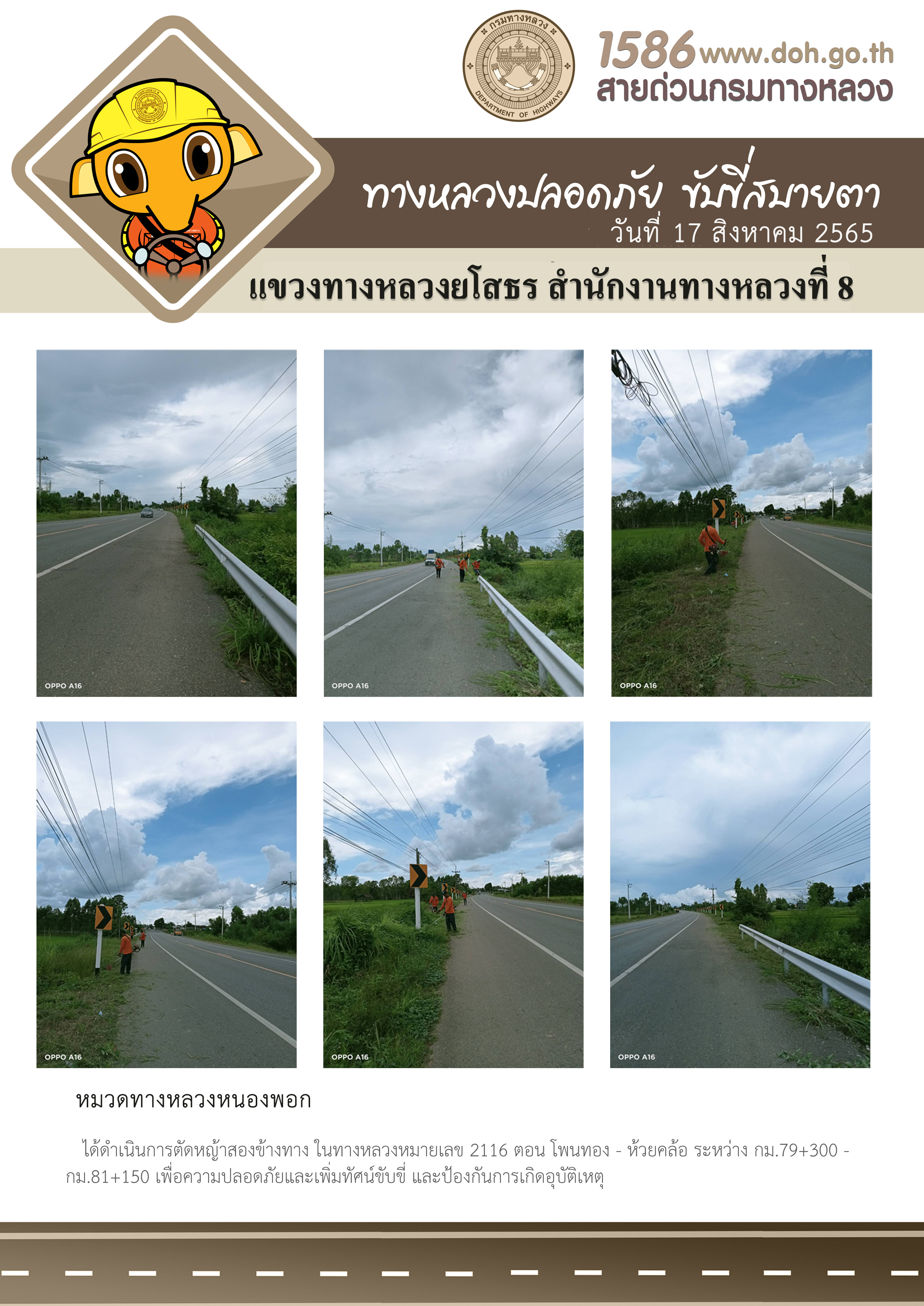วันที่ 17 สิงหาคม 2565 หมวดทางหลวงหนองพอก ได้ดำเนินการตัดหญ้าสองข้างทาง ในทางหลวงหมายเลข 21 16 ตอน โพนทอง - ห้วยคล้อ ระหว่าง กม.79+300 - กม.81 + 150 เพื่อความปลอดภัยและเพิ่มทัศนวิสัยแก่ผู้ขับขี่ และป้องกันการเกิดอุบัติเหตุ