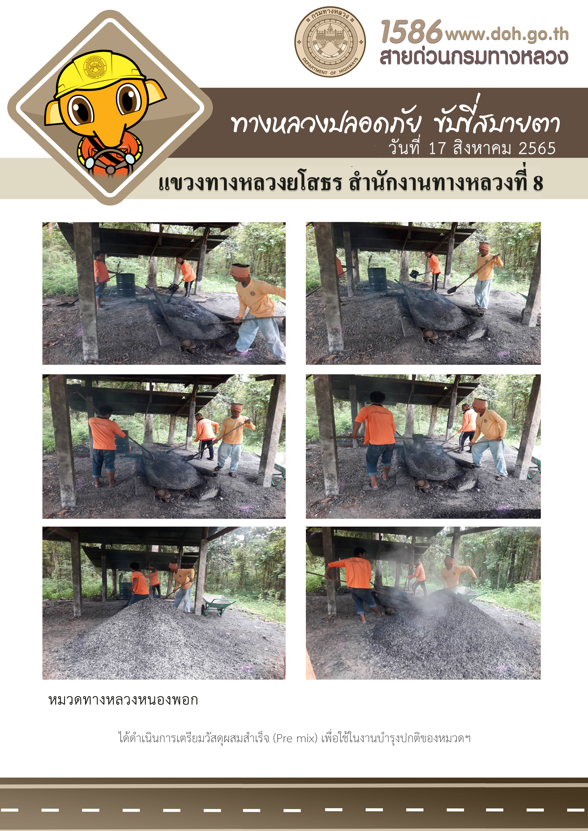 วันที่ 17 สิงหาคม 2565 หมวดทางหลวงหนองพอก ได้ดำเนินการเตรียมวัสดุผสมสำเร็จ (Pre mix) เพื่อใช้ในงานบำรุงปกติของหมวดฯ