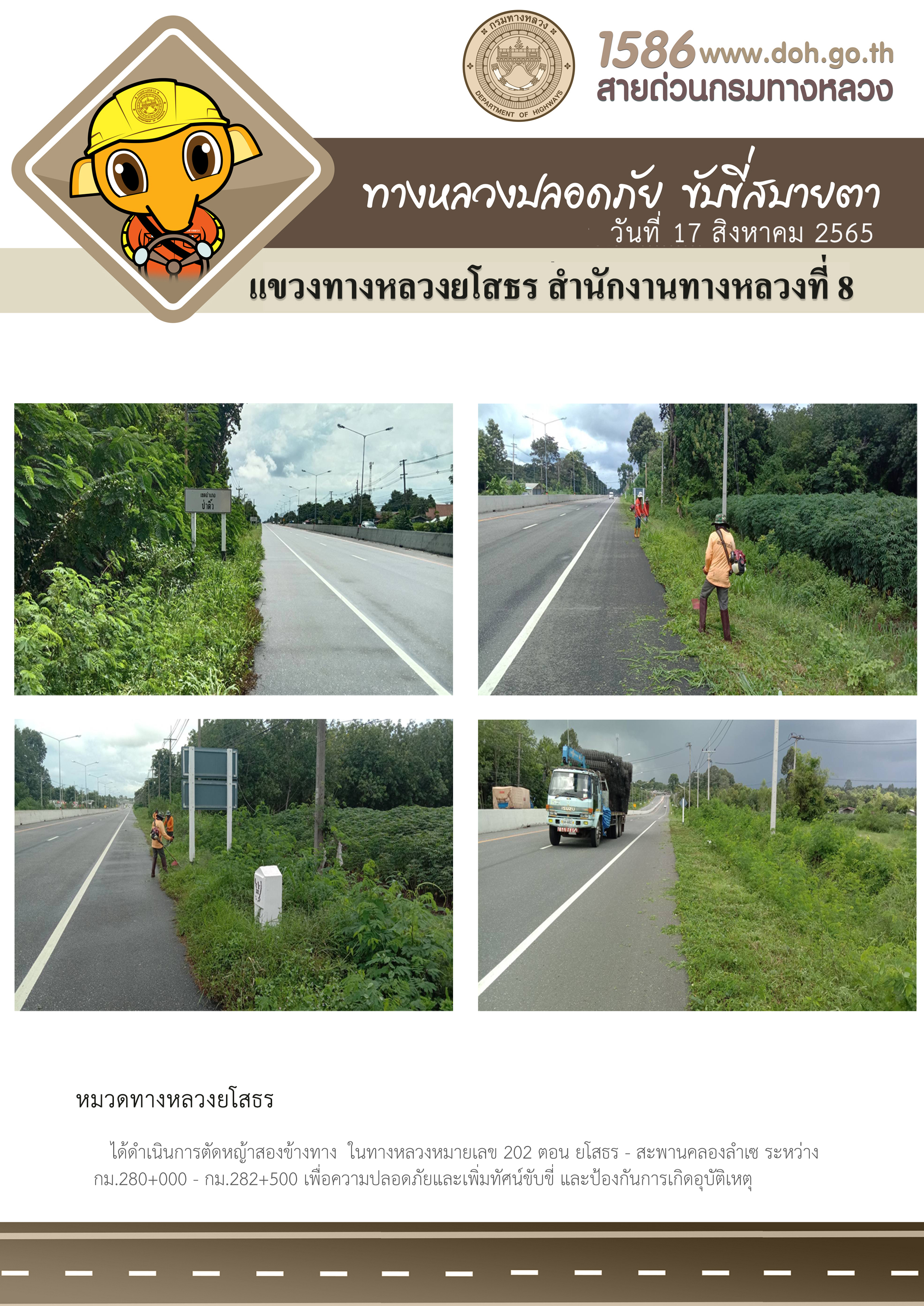 วันที่ 17 สิงหาคม 2565 หมวดทางหลวงยโสธร ได้ดำเนินการตัดหญ้าสองข้างทาง ในทางหลวงหมายเลข 202 ตอน ยโสธร - สะพานคลองลำเซ ระหว่าง กม.280 +000 - กม.282+500 เพื่อความปลอดภัยและเพิ่มทัศนวิสัยแก่ผู้ขับขี่ และป้องกันการเกิดอุบัติเหตุ