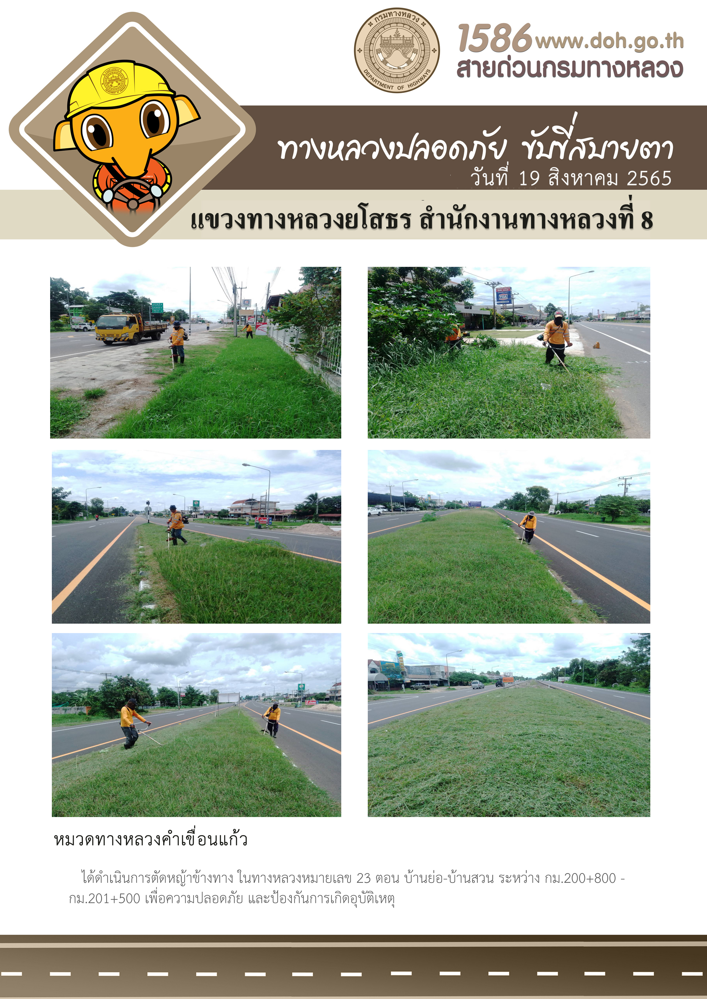 วันที่ 19 สิงหาคม 2565 หมวดทางหลวงคำเขื่อนแก้ว ได้ดำเนินการตัดหญ้าข้างทาง ในทางหลวงหมายเลข 23 ตอน บ้านย่อ-บ้านสวน ระหว่าง กม.200+800 - กม.201+500 เพื่อความปลอดภัย และป้องกันการเกิดอุบัติเหตุ