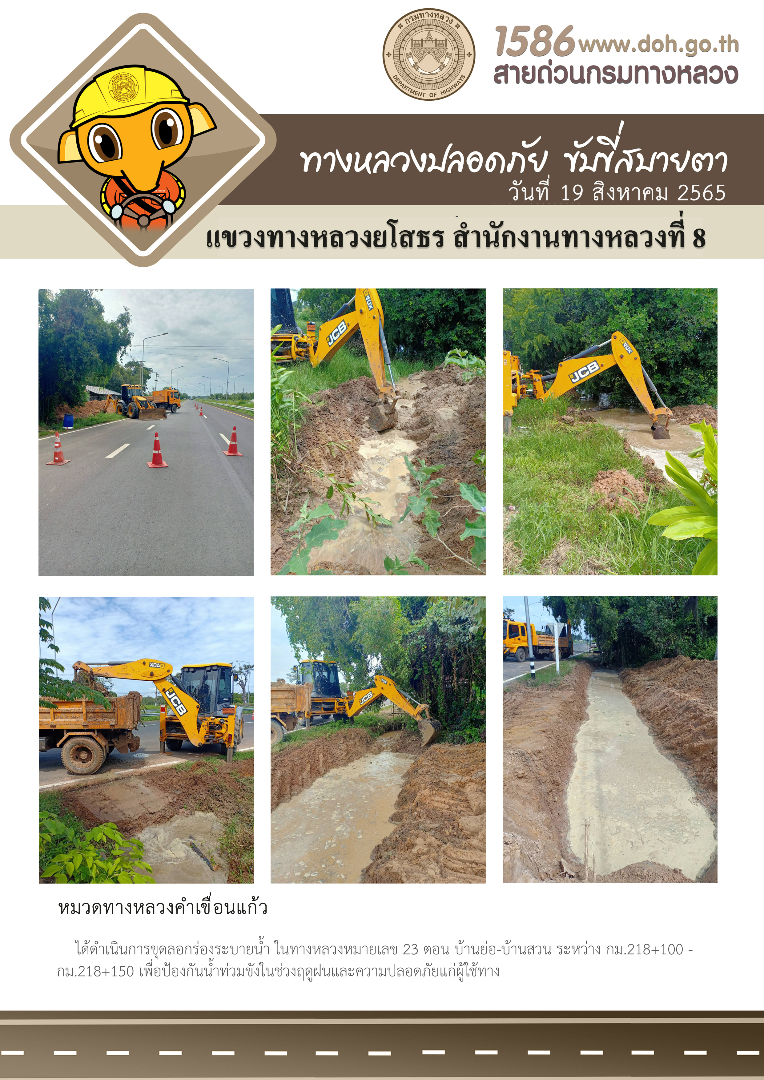 วันที่ 19 สิงหาคม 2565 หมวดทางหลวงคำเขื่อนแก้ว ได้ดำเนินการขุดลอกร่องระบายน้ำ ในทางหลวงหมายเลข 23 ตอน บ้านย่อ-บ้านสวน ระหว่าง กม.218+100 - กม.218+150 เพื่อป้องกันน้ำท่วมขังในช่วงฤดูฝนและความปลอดภัยแก่ผู้ใช้ทาง