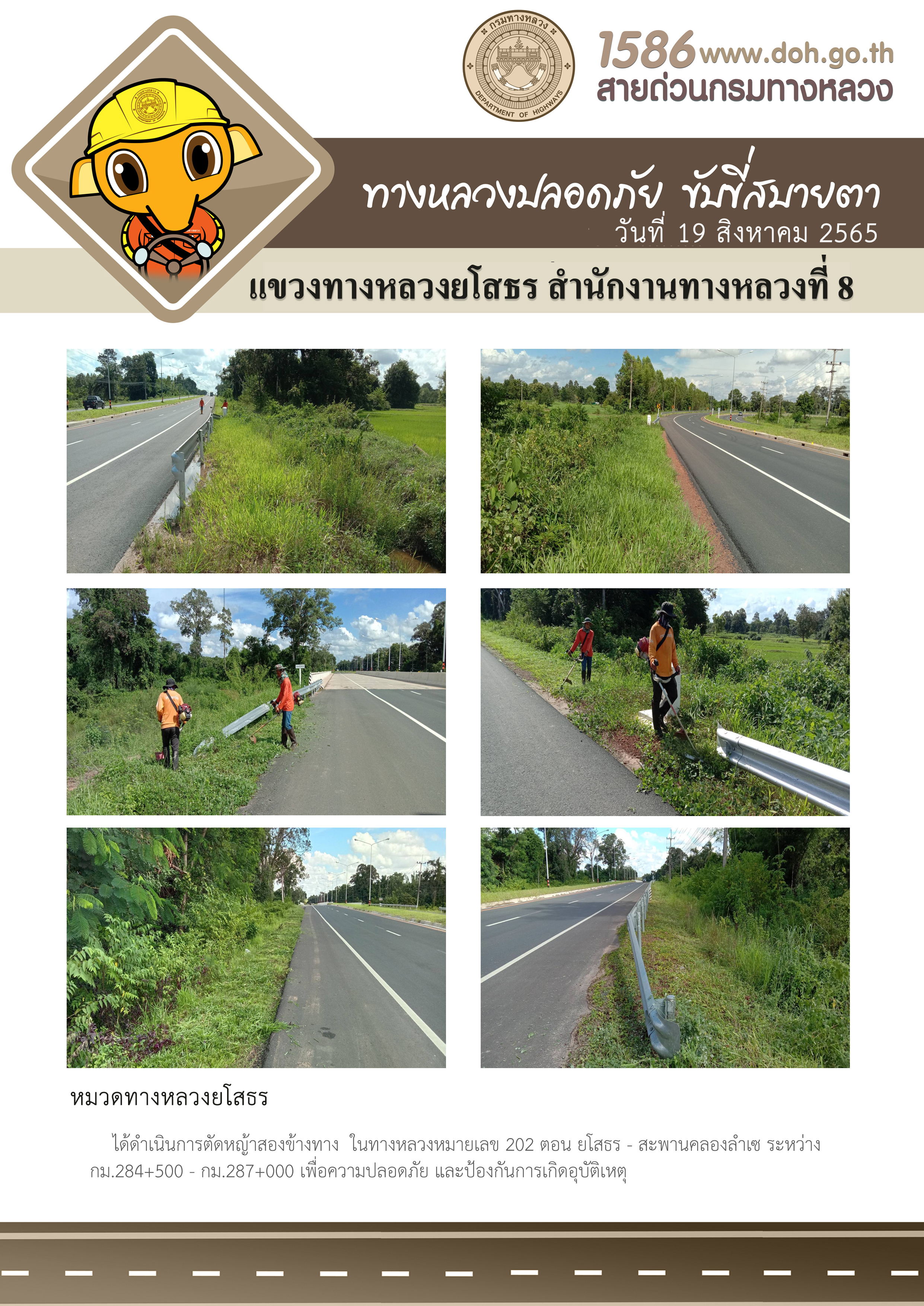 วันที่ 19 สิงหาคม 2565 หมวดทางหลวงยโสธร ได้ดำเนินการตัดหญ้าสองข้างทาง ในทางหลวงหมายเลข 202 ตอน ยโสธร - สะพานคลองลำเช ระหว่าง กม.284+500 - กม.287+000 เพื่อความปลอดภัย และป้องกันการเกิดอุบัติเหตุ