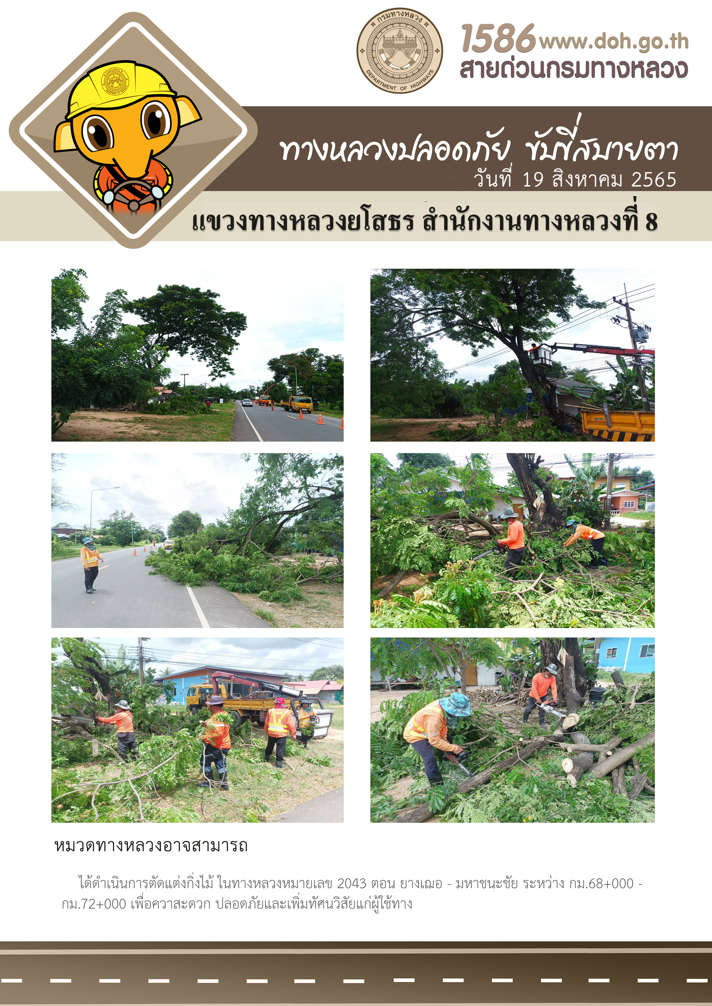 วันที่ 19 สิงหาคม 2565 หมวดทางหลวงอาจสามารถ ได้ดำเนินการตัดแต่งกิ่งไม้ ในทางหลวงหมายเลข 2043 ตอน ยางเฌอ - มหาชนะชัย ระหว่าง กม.68+000 - กม.72+000 เพื่อความสะดวก ปลอดภัยและเพิ่มทัศนวิสัยแก่ผู้ใช้ทาง