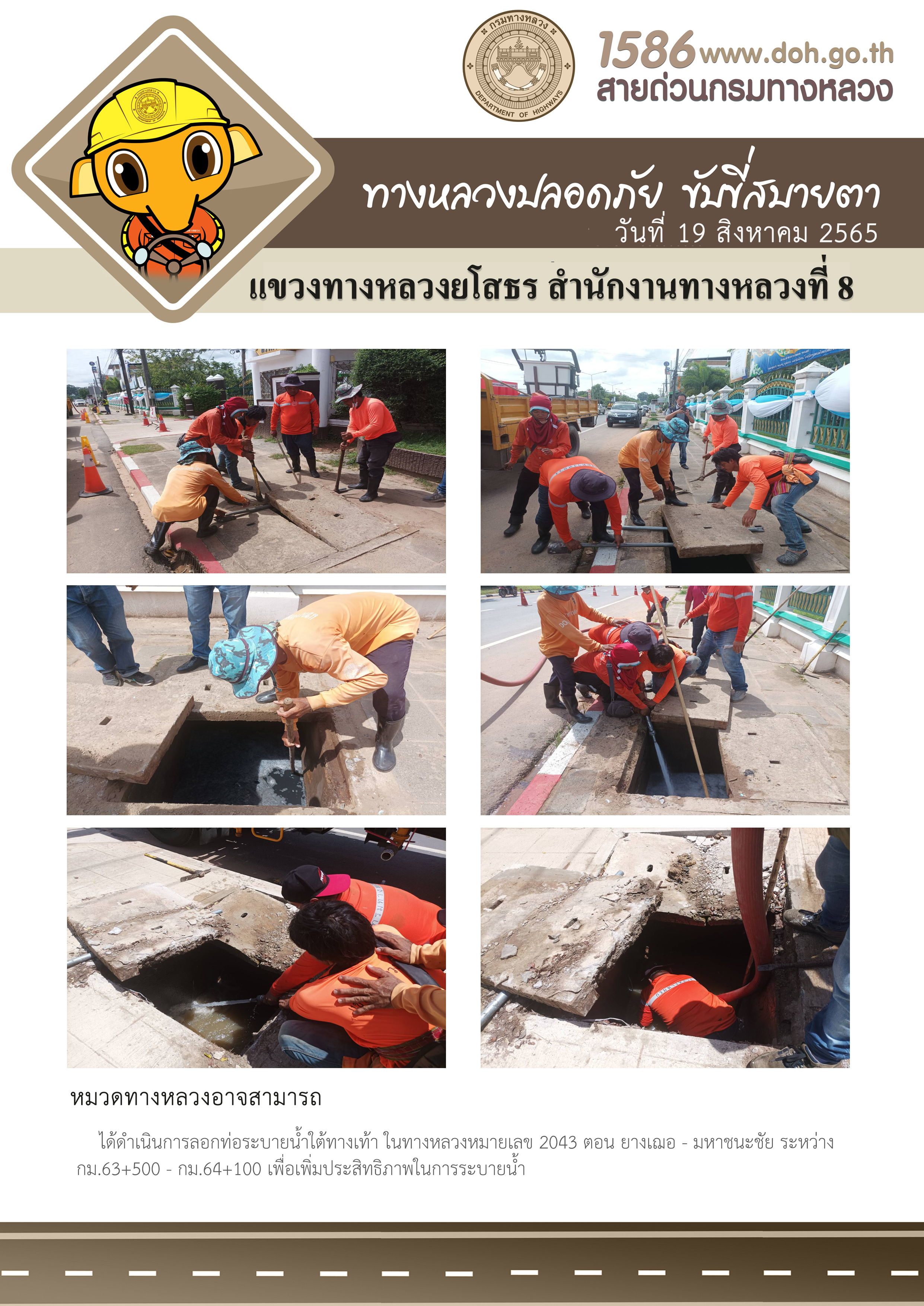 วันที่ 19 สิงหาคม 2565 หมวดทางหลวงอาจสามารถ ได้ดำเนินการลอกท่อระบายน้ำใต้ทางเท้า ในทางหลวงหมายเลข 2043 ตอน ยางเฌอ - มหาชนะชัย ระหว่าง กม.63+500 - กม.64+100 เพื่อเพิ่มประสิทธิภาพในการระบายน้ำ