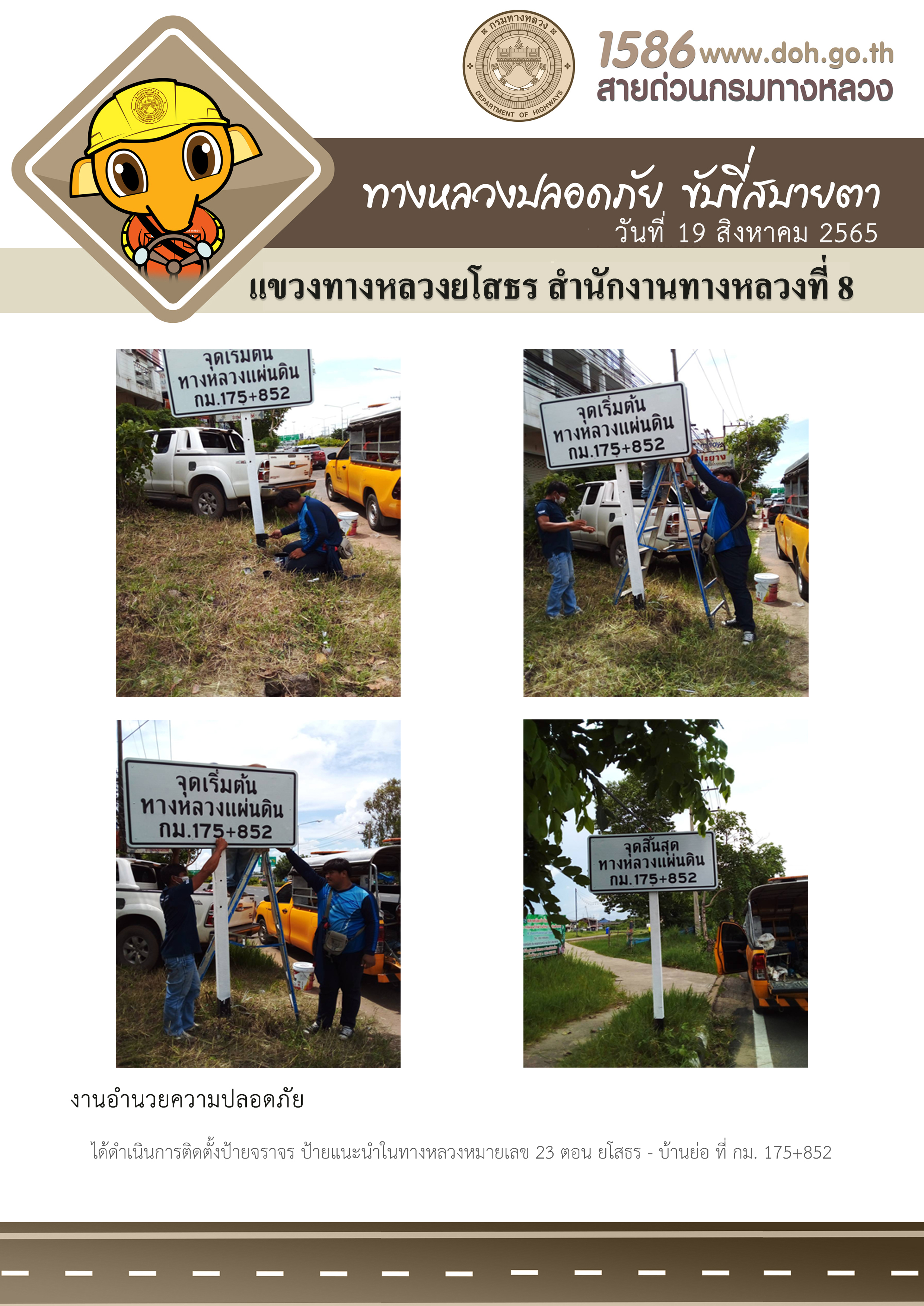วันที่ 19 สิงหาคม 2565 งานอำนวยความปลอดภัย ได้ดำเนินการติดตั้งป้ายจราจร ป้ายแนะนำในทางหลวงหมายเลข 23 ตอน ยโสธร - บ้านย่อ ที่ กม. 175+852